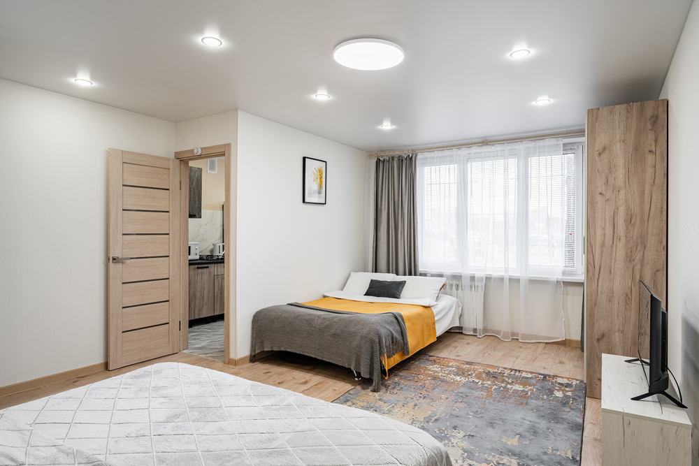В спальне Вас ждёт удобная двуспальная кровать с мягкими подушками и качественным бельём для полноценного отдыха.