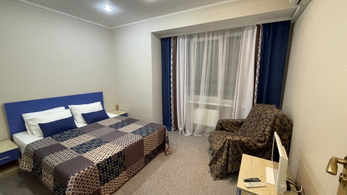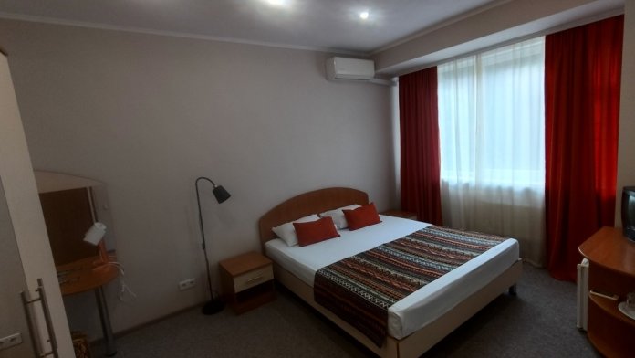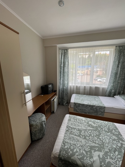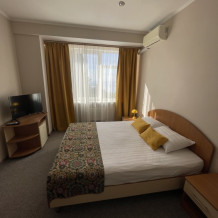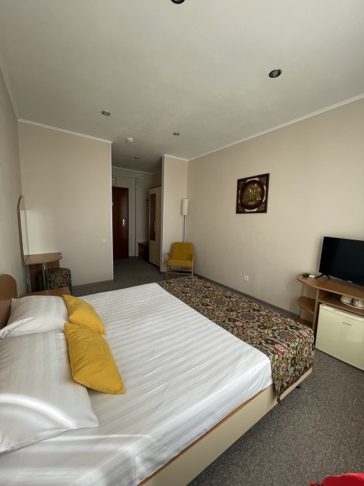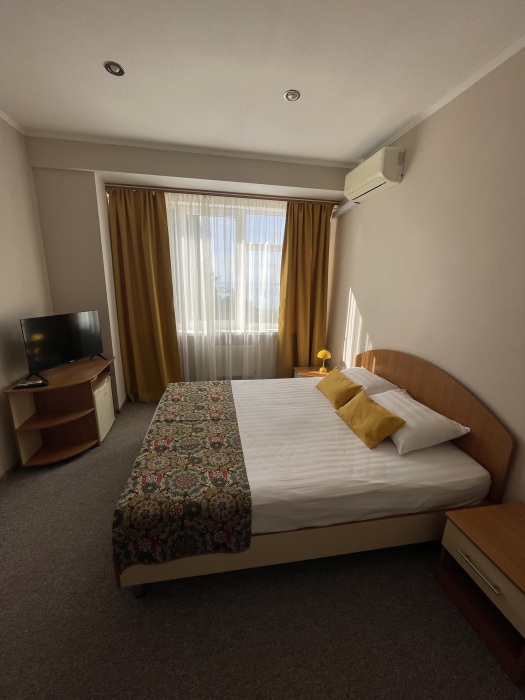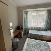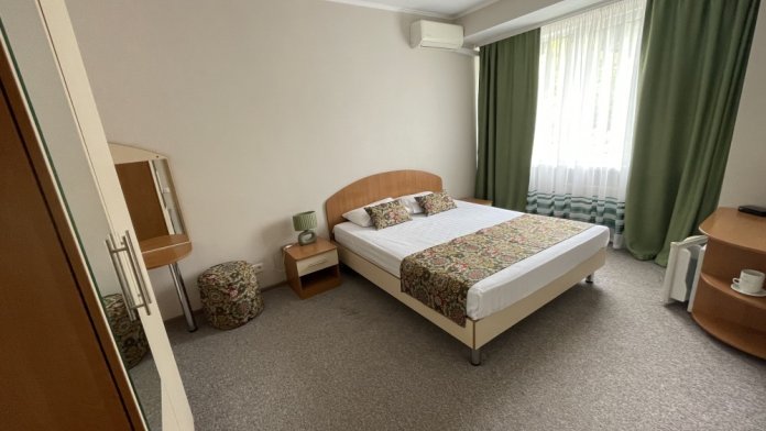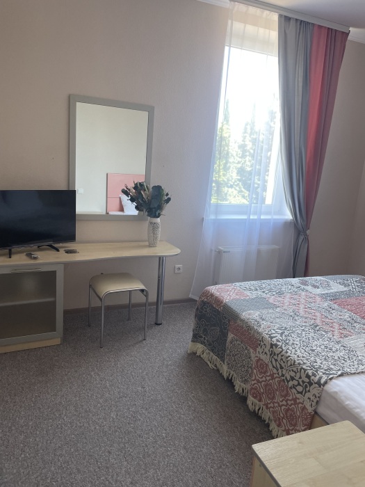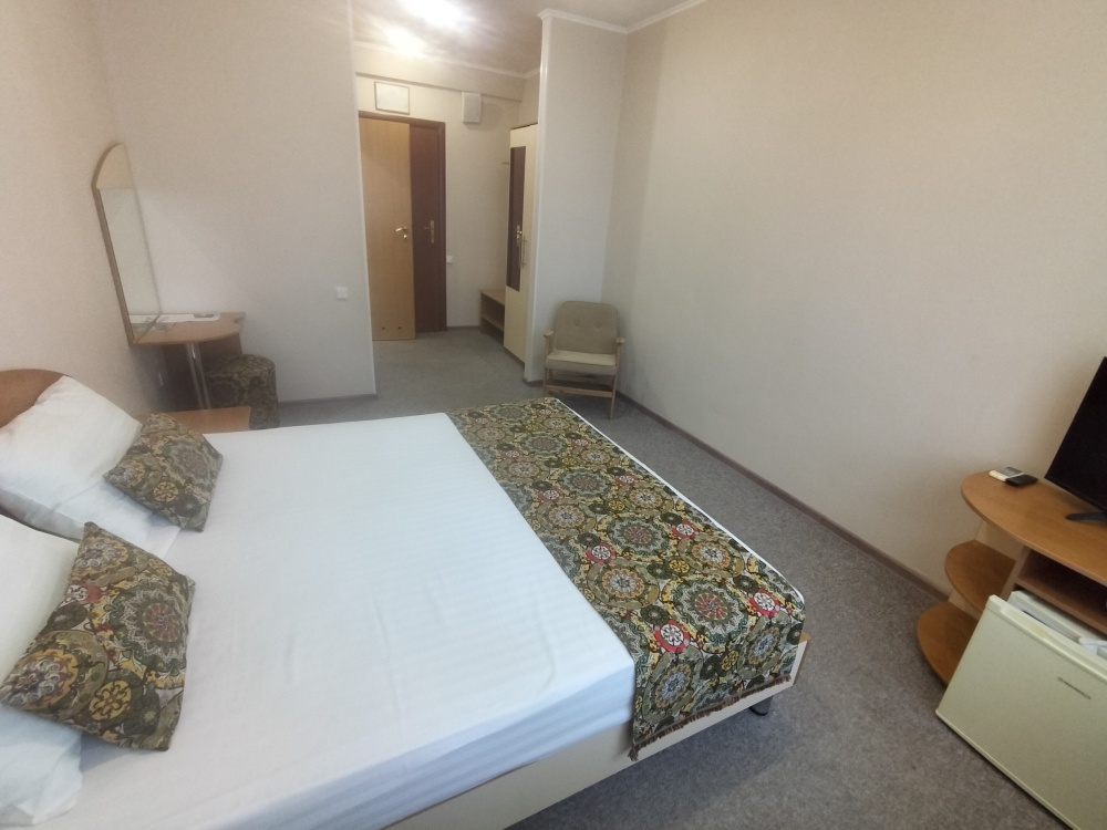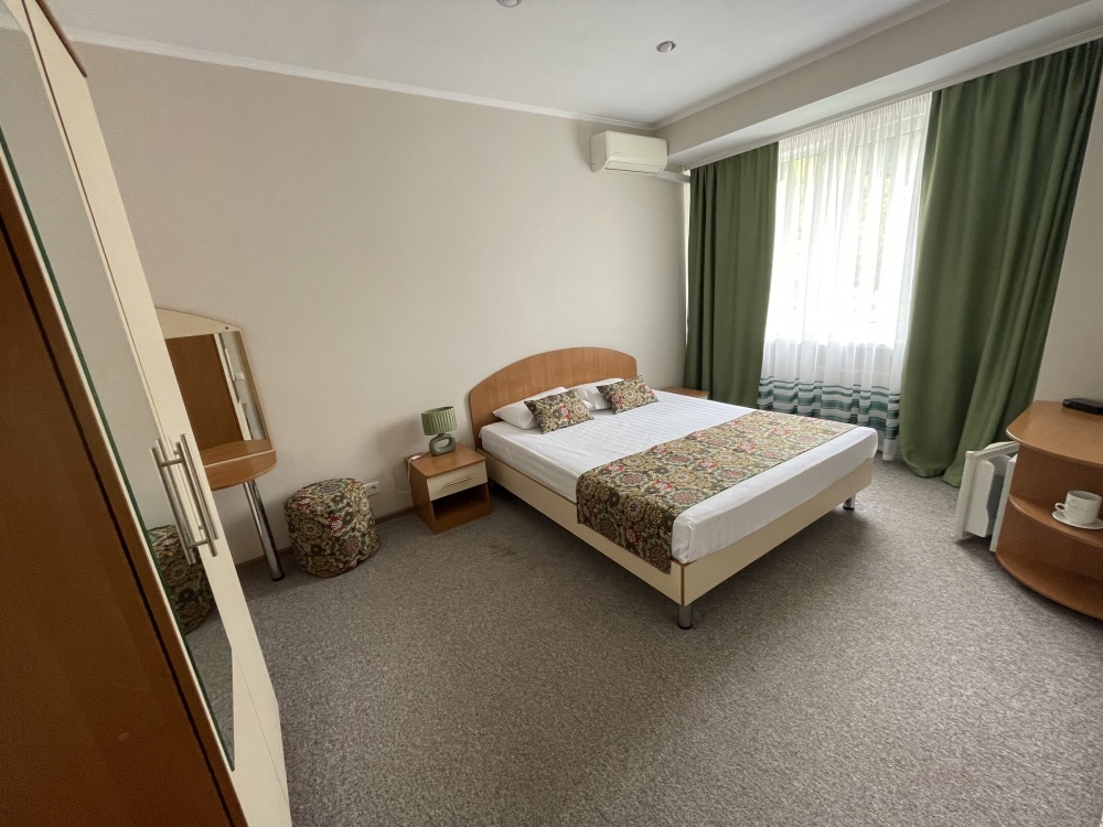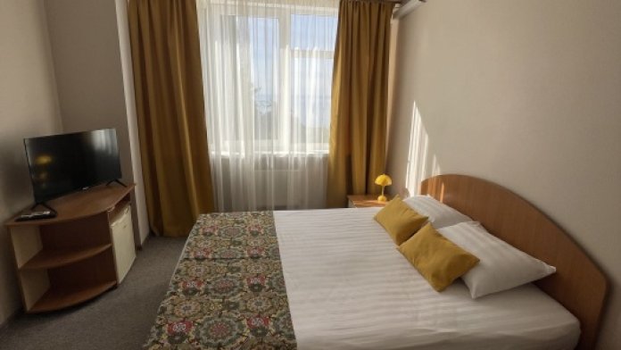 Комфортабельный однокомнатный номер с одной двухспальной кроватью или двумя односпальными. Номер с видом на море и парк отеля. В номере есть кресло, столик для телевизора, столик с зеркалом, бельевой шкаф-прихожая, кондиционер, прикроватные тумбочки и светильники. Полноценный санузел, гигиенические принадлежности. В коридоре кулер с горячей и охлажденной водой, микроволновая печь, гладильная доска и утюг.