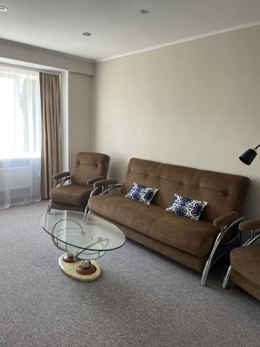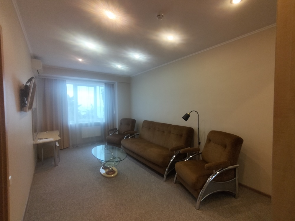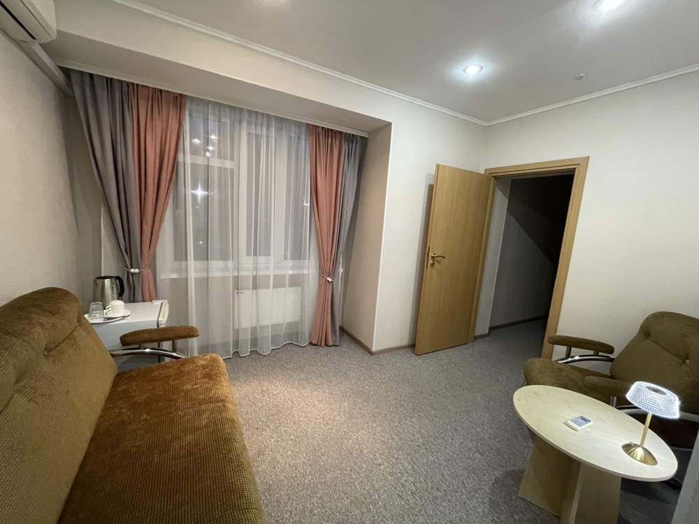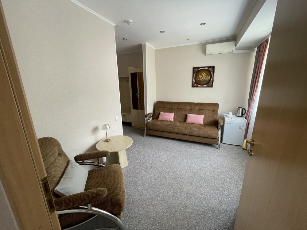 Двухкомнатный просторный номер: спальня с двуспальной кроватью, тумбой под тв и зеркалом, прикроватные тумбочки, светильник и гостиная со столиком, холодильник, платяной шкаф, чайник, чай, кофе в номере, кондиционер, посуда.