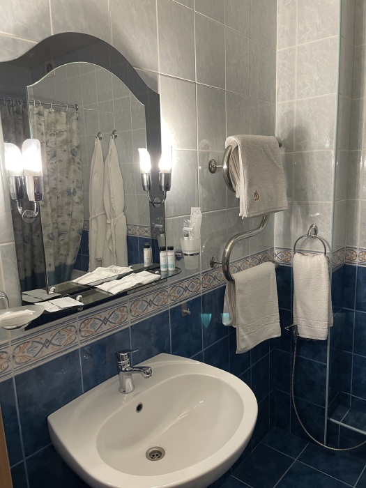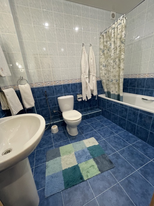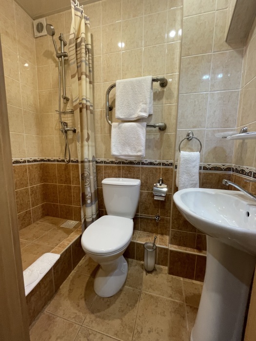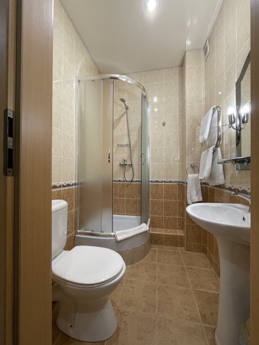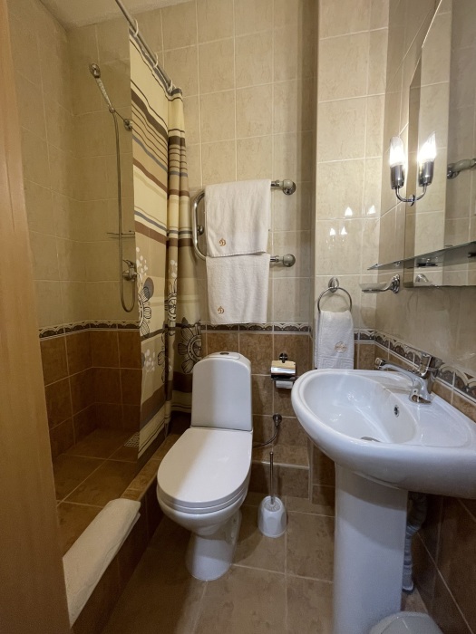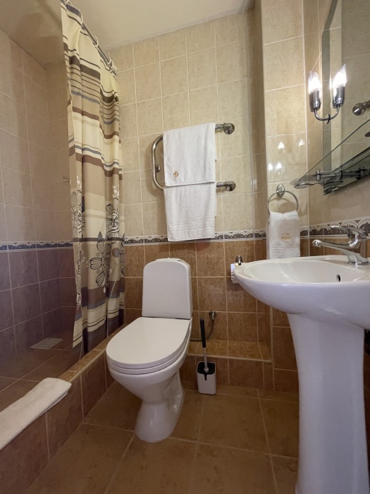 Просторный полноценный санузел с душевой кабиной, халаты, гигиенические принадлежности.