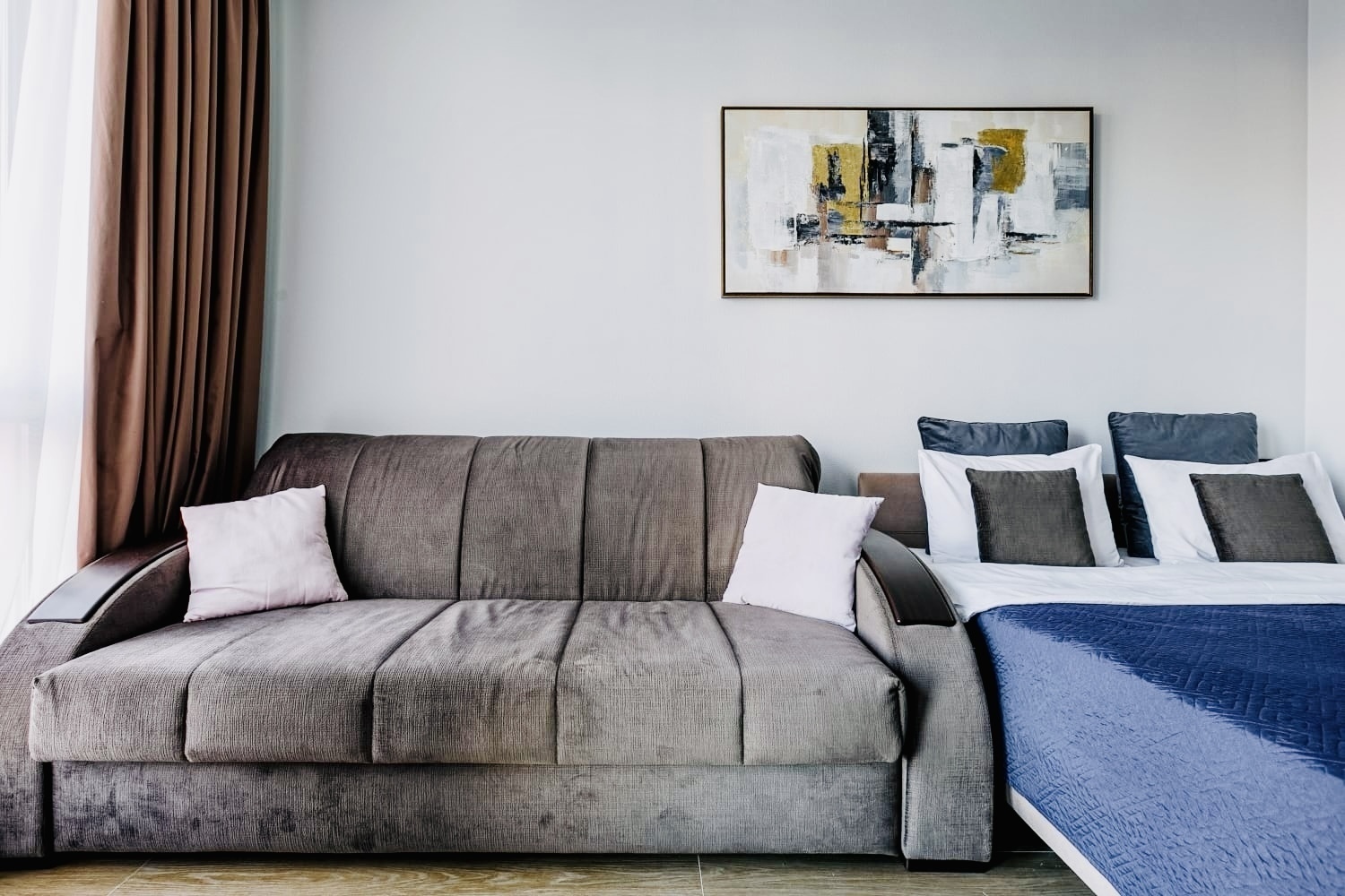 - Спальня: большая кровать 160×200 см (ортопедический матрас).