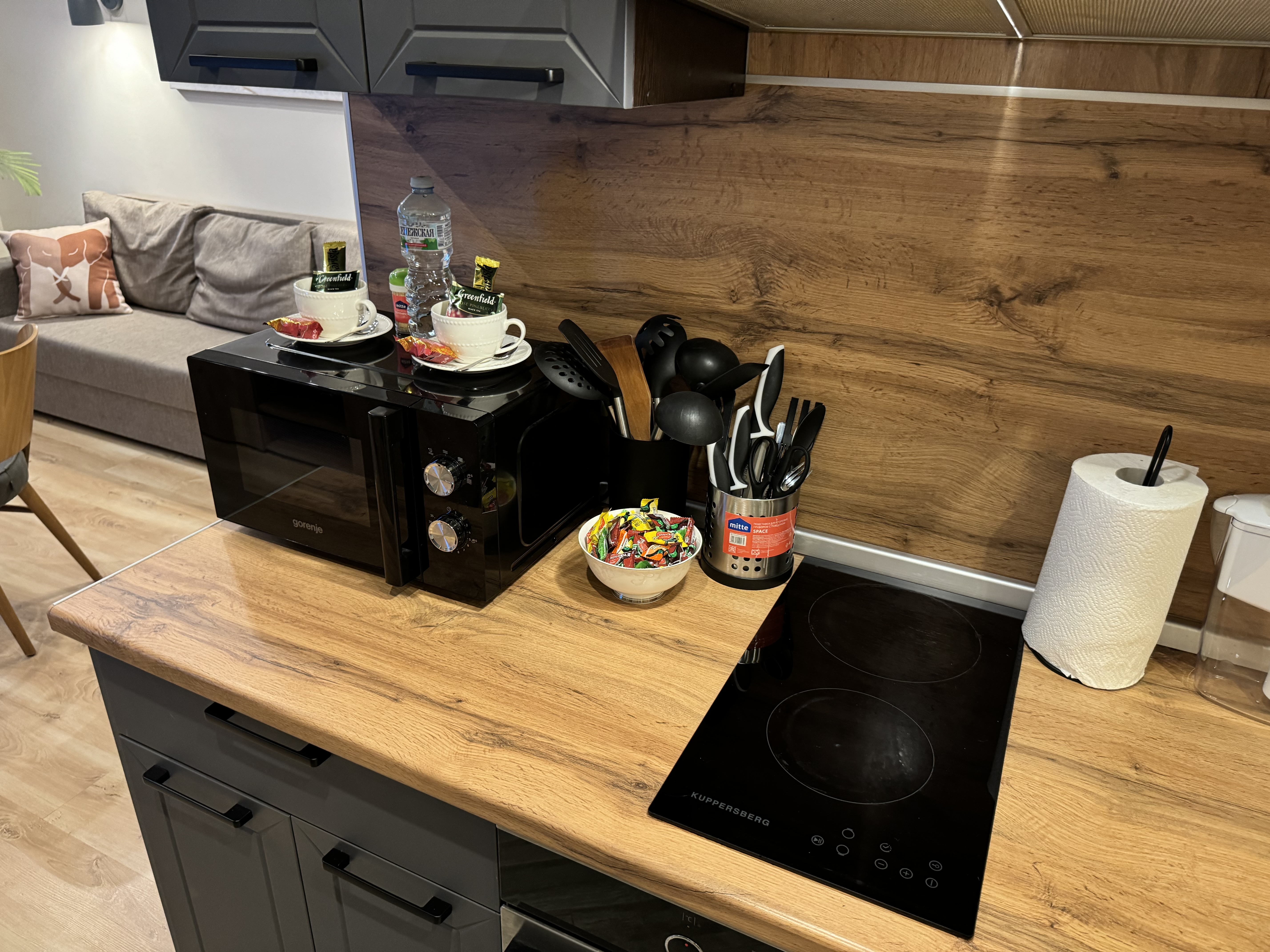 - На кухне вся техника: чайник, СВЧ, плита, духовка, холодильник.