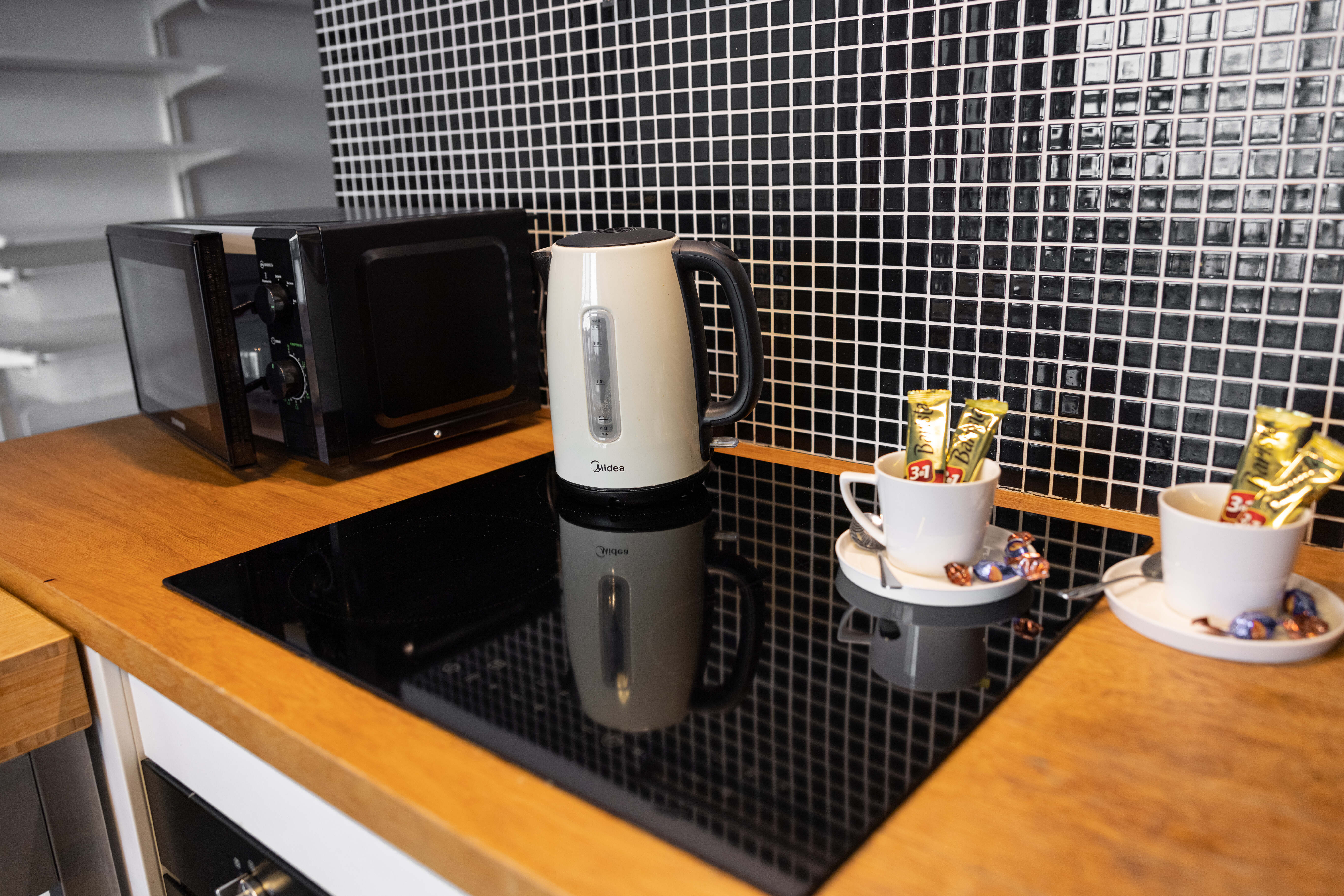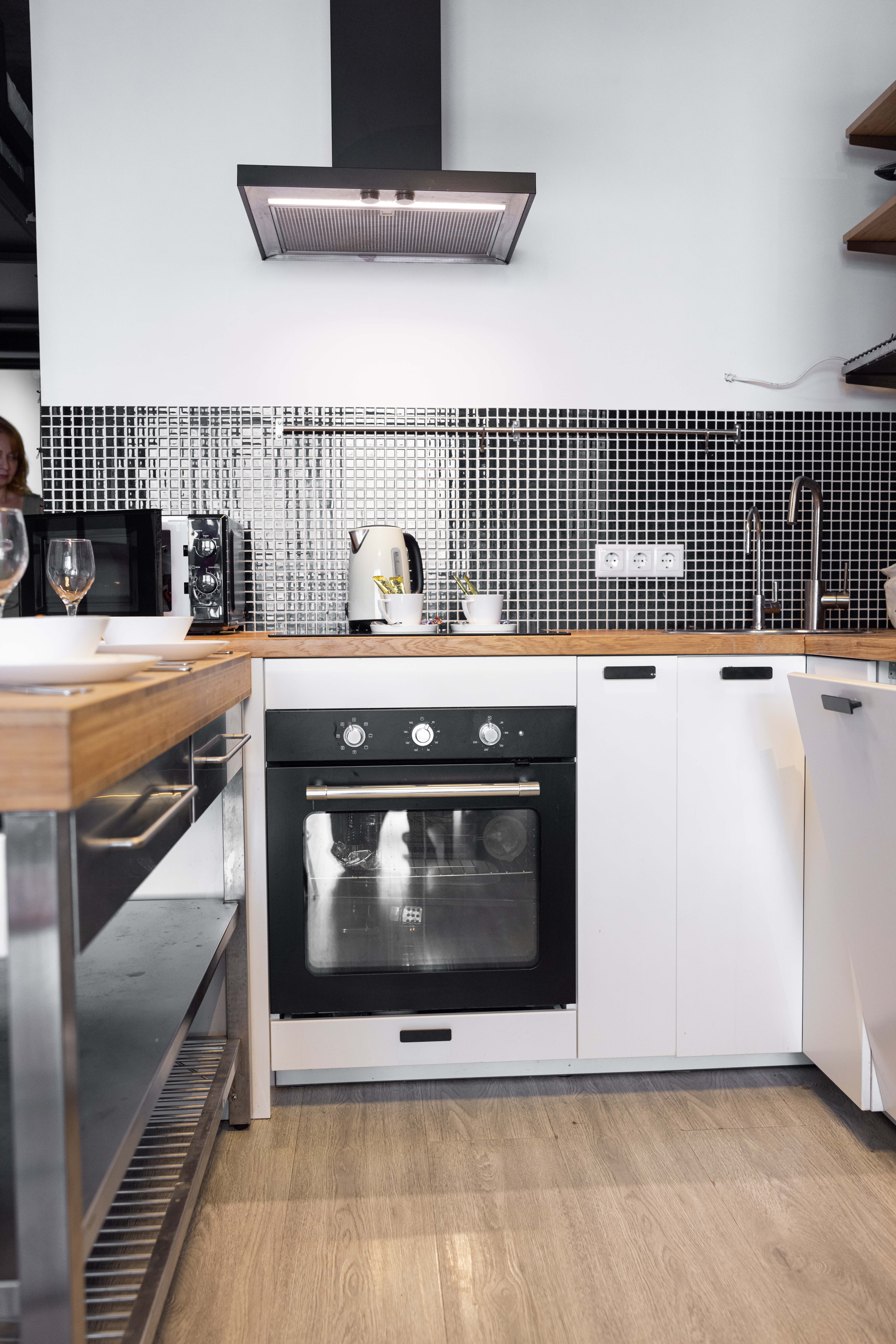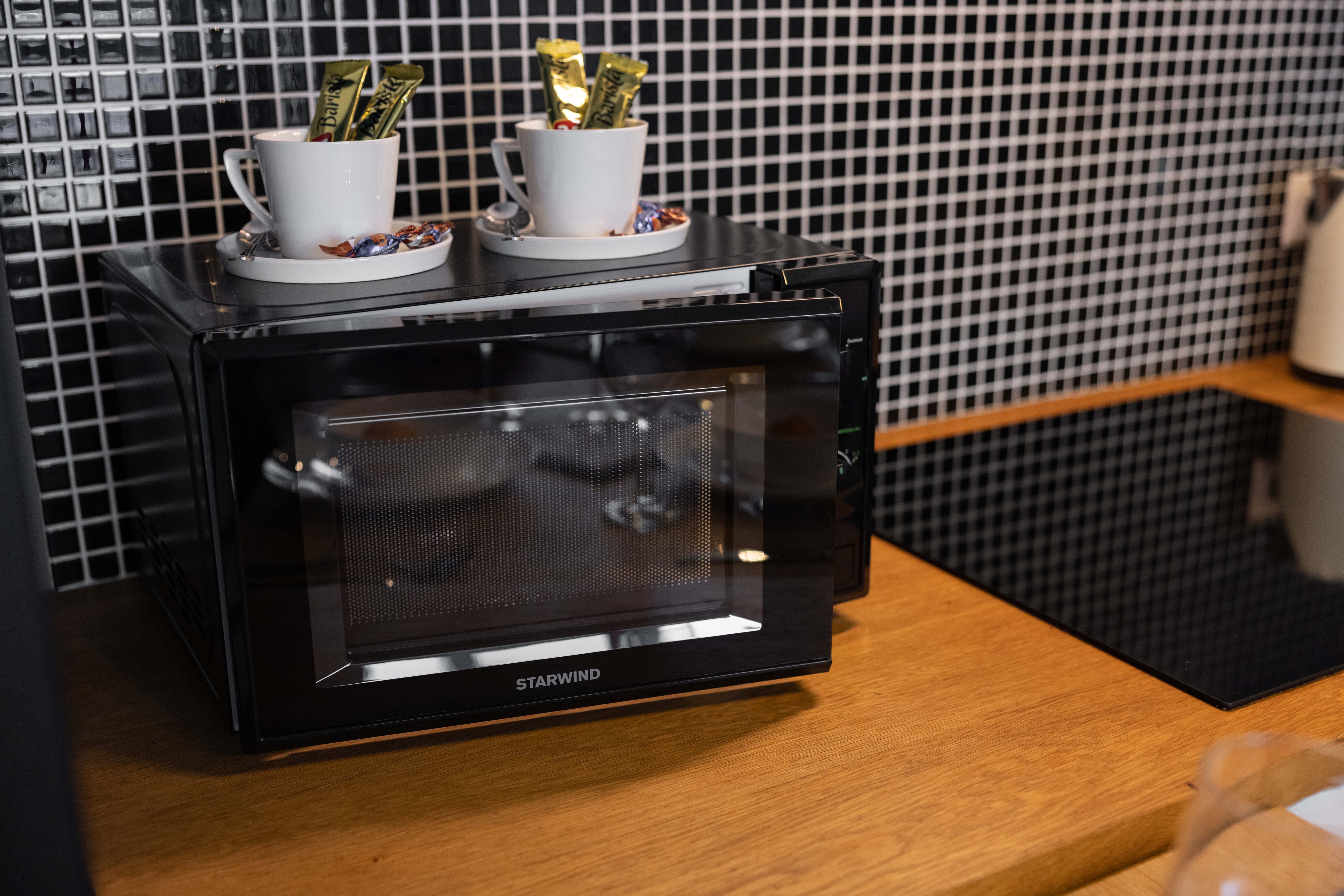 - На кухне вся техника: чайник, СВЧ, плита, духовка, холодильник.