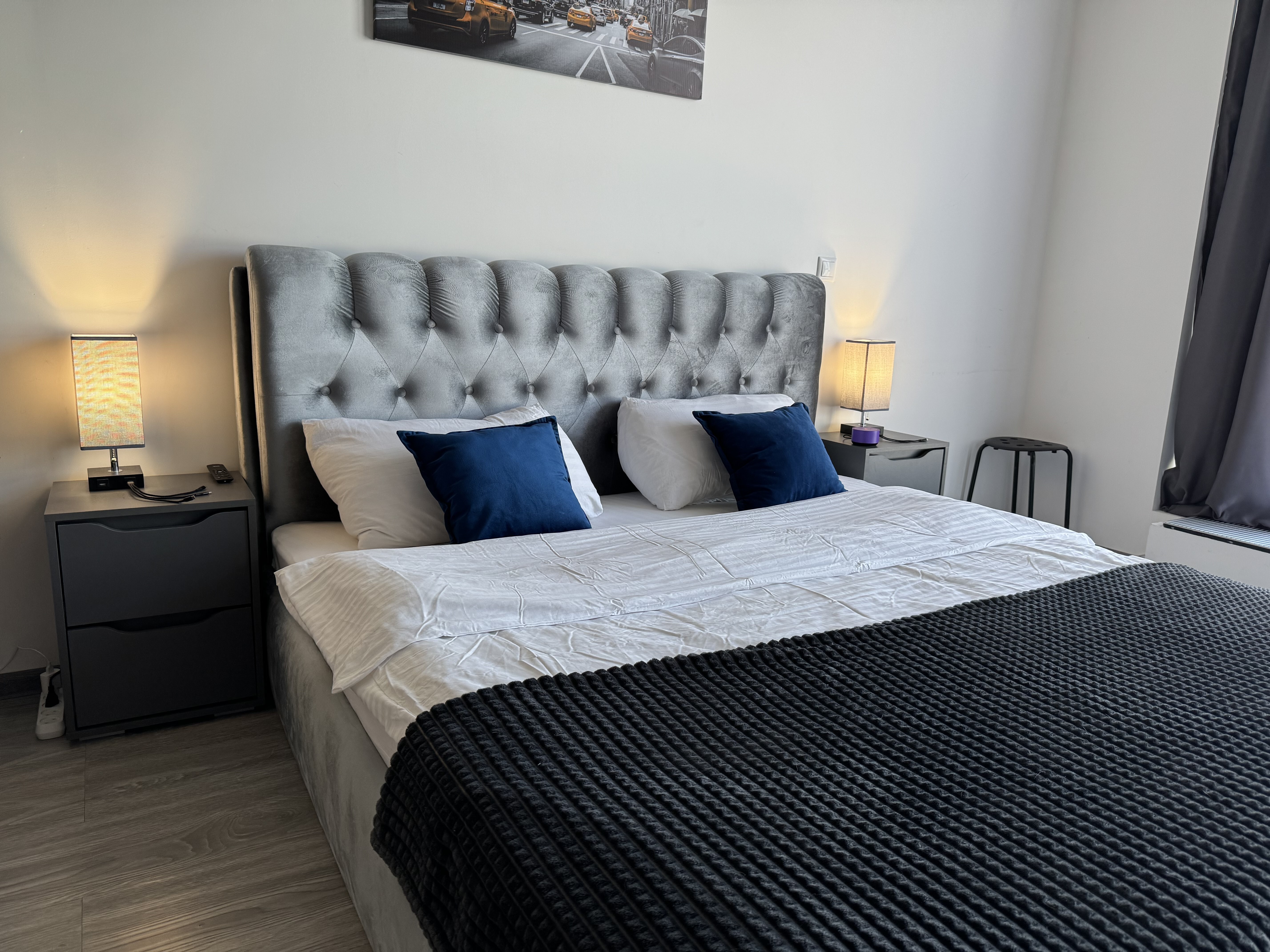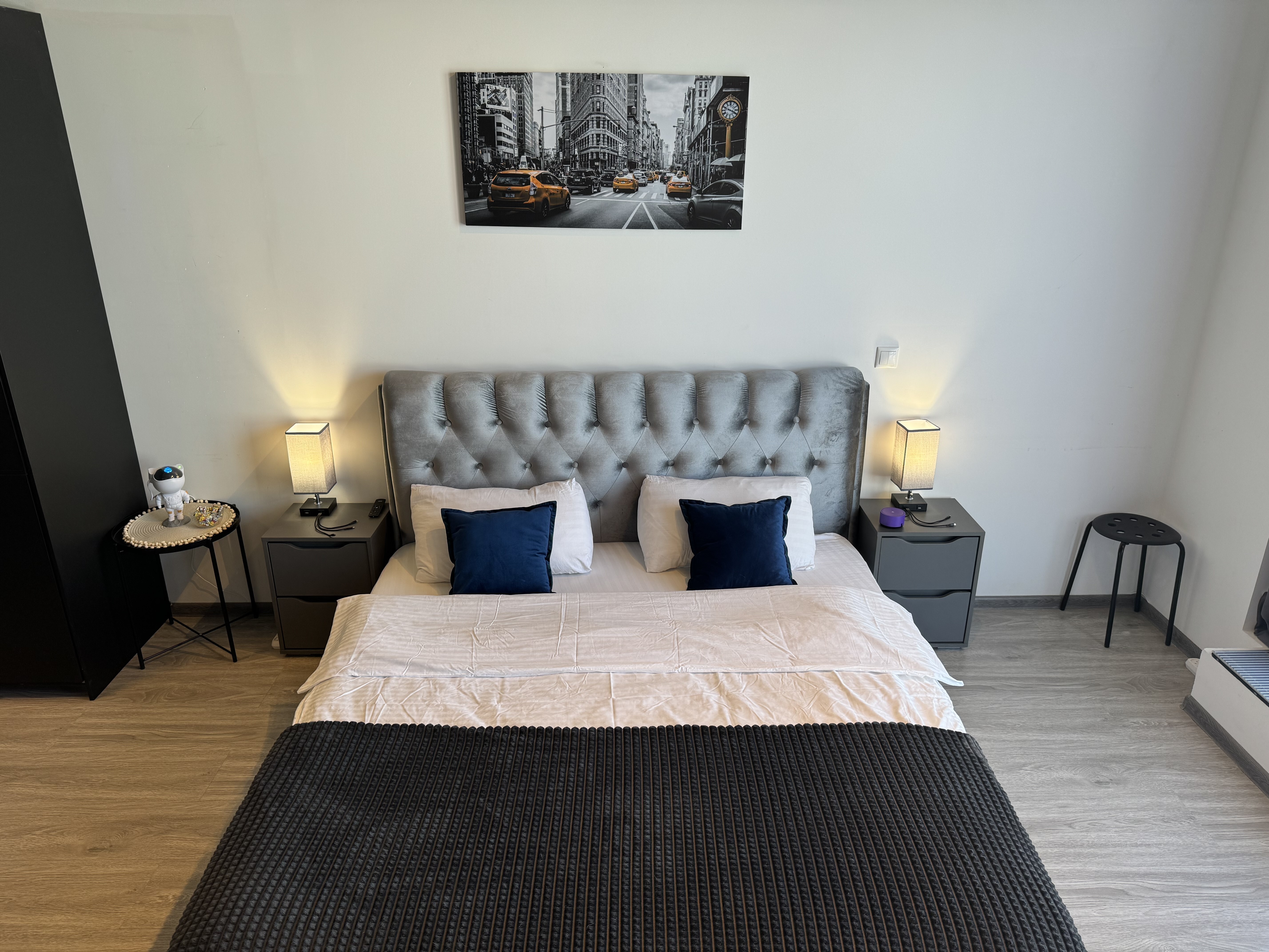 - Спальня: большая кровать 160×200 см (ортопедический матрас).