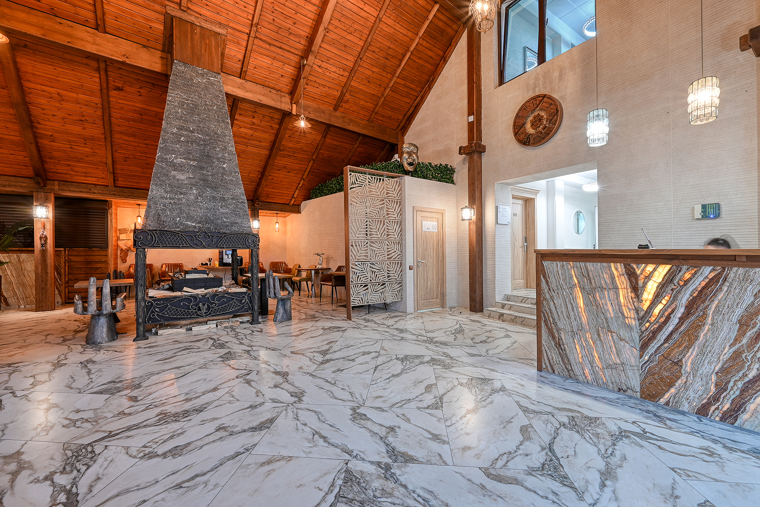 Апартаменты оформлены с использованием натуральных материалов. Интерьер выполнен в современном стиле, сочетающем дерево и мрамор.