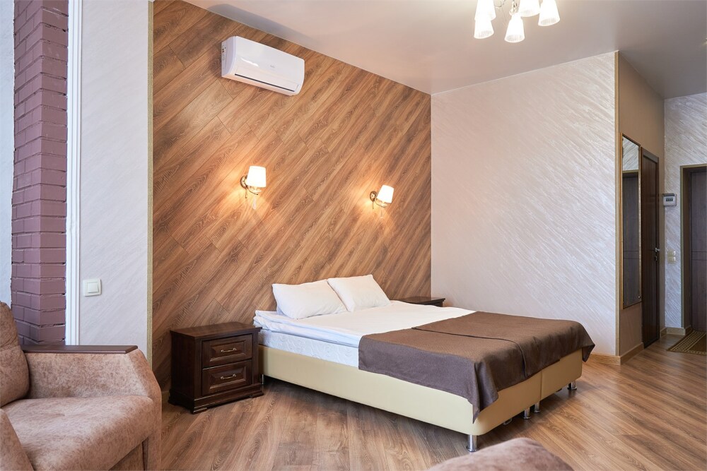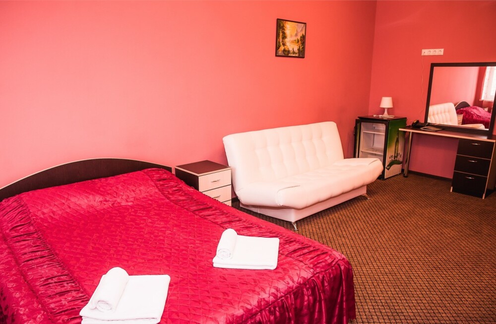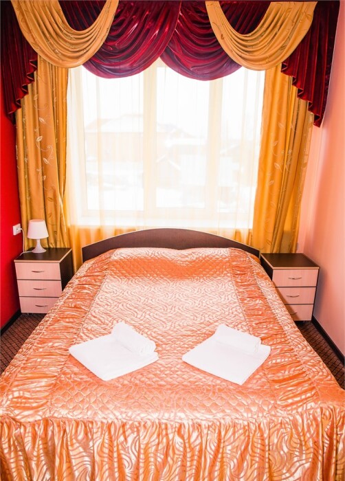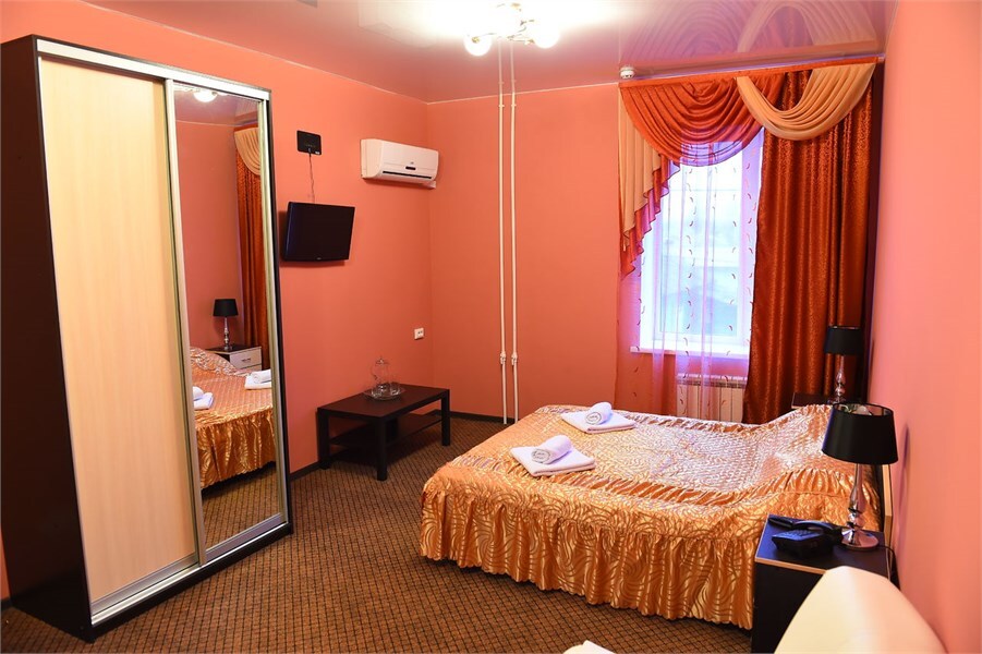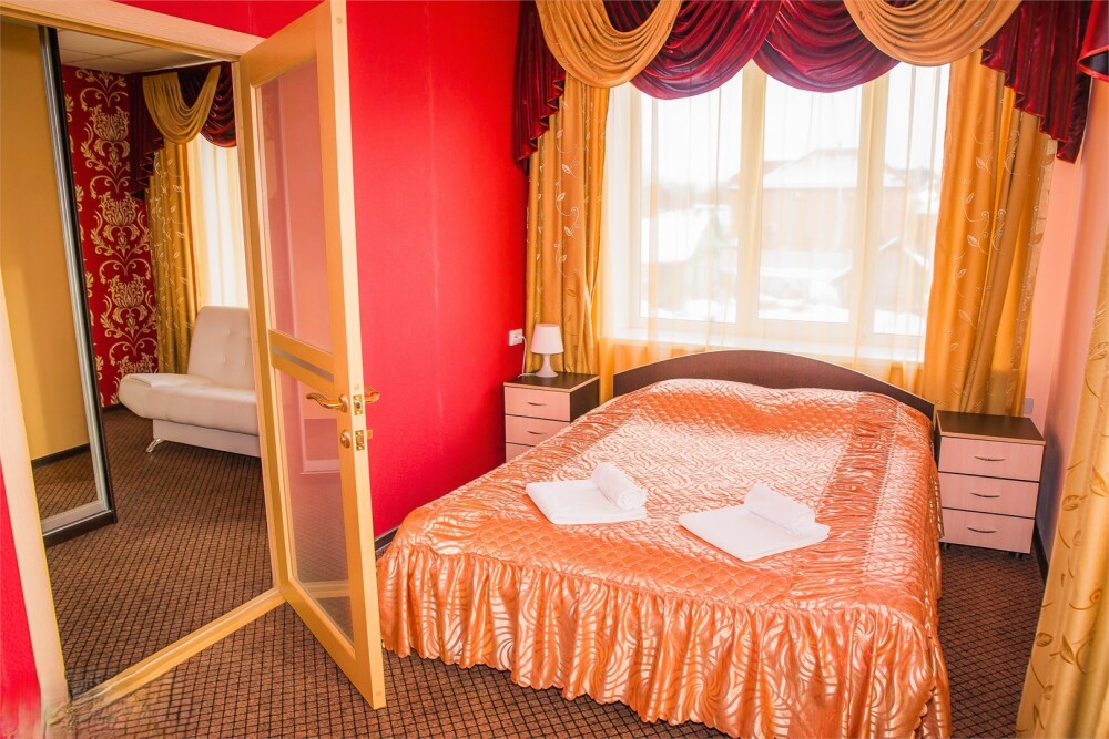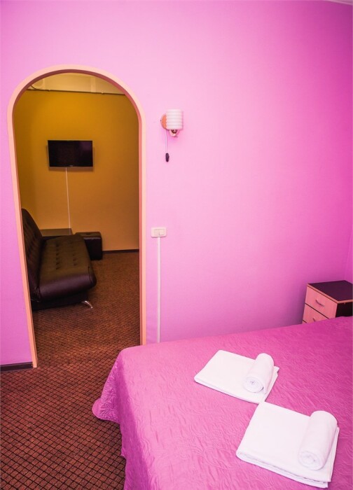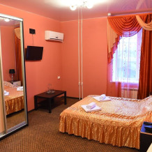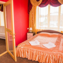 Двухкомнатный номер. В спальне: двуспальная кровать, прикроватные тумбочки, прикроватные светильники, туалетный столик, журнальный столик, два пуфа, кондиционер. В гостинной: удобный диван, журнальный столик, шкаф-купе, телевизор, телефон, wi-fi. Санузел, душевая кабина, туалетные принадлежности, банные принадлежности.