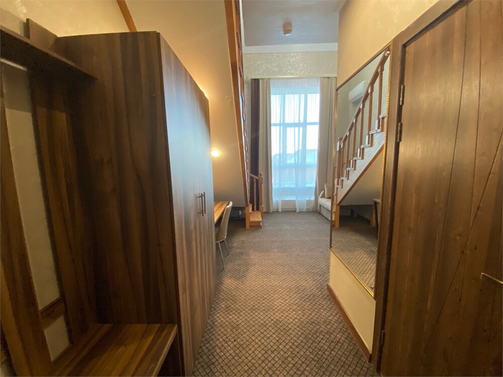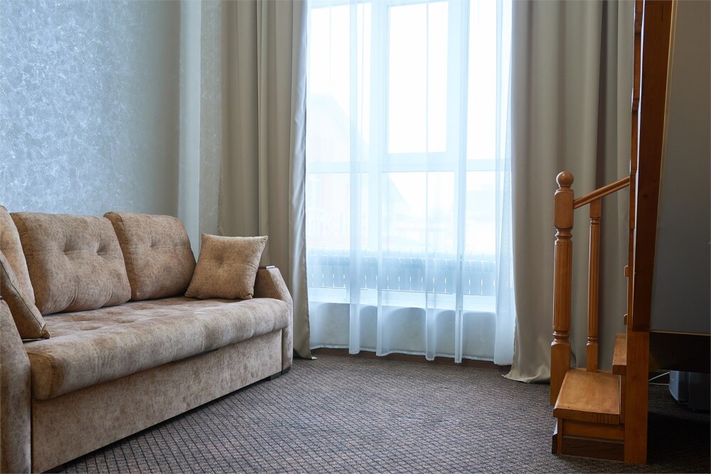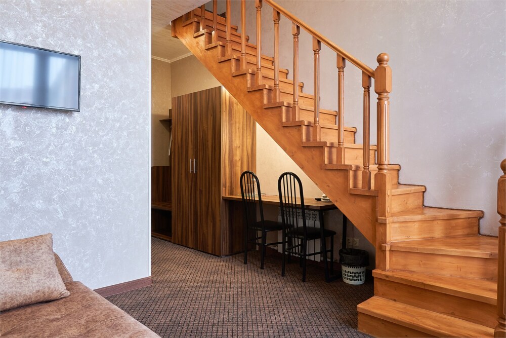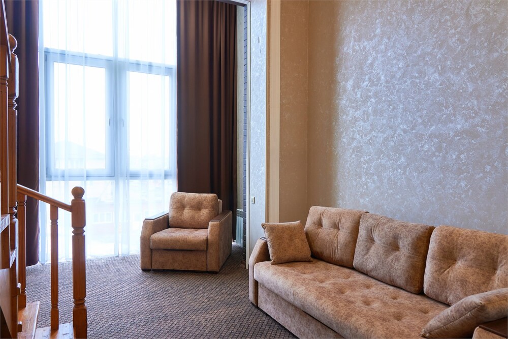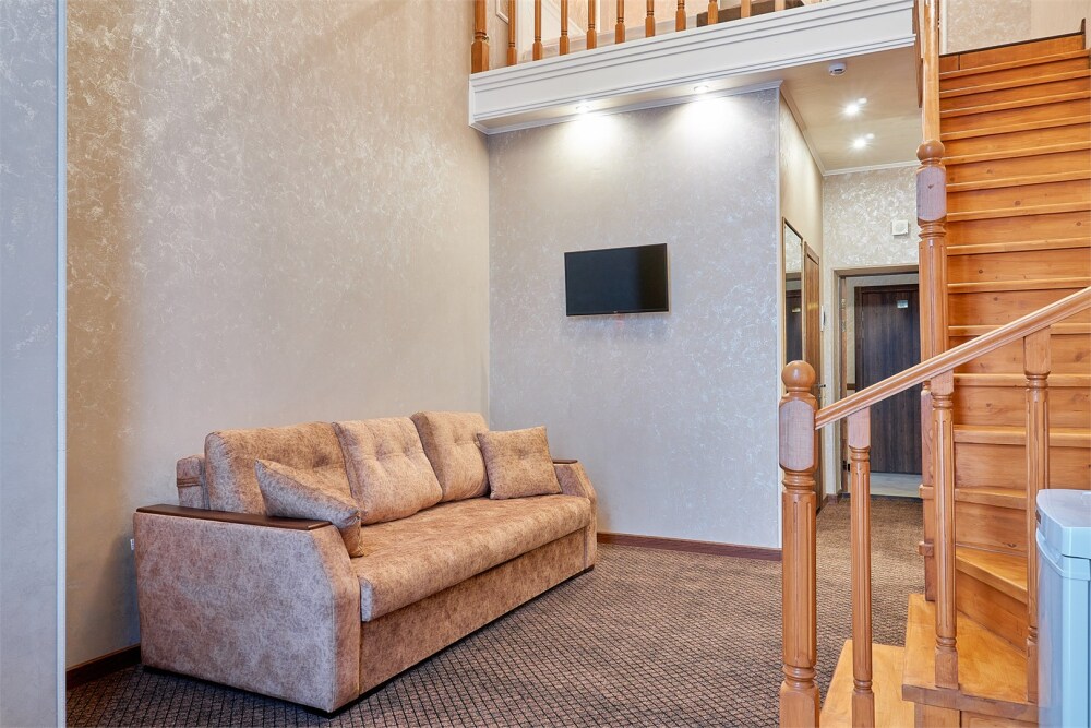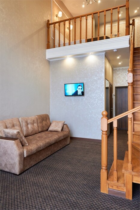 Просторный двухуровневый номер высшей категории с гостинной и спальней. Жилая площадь номера 30-35 м2. Большие окна.