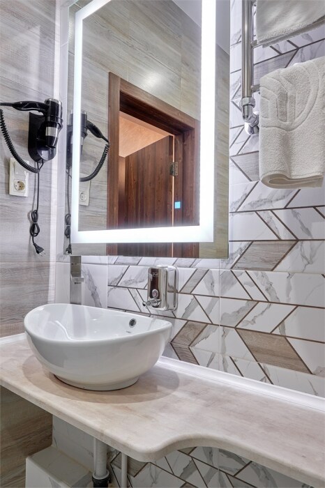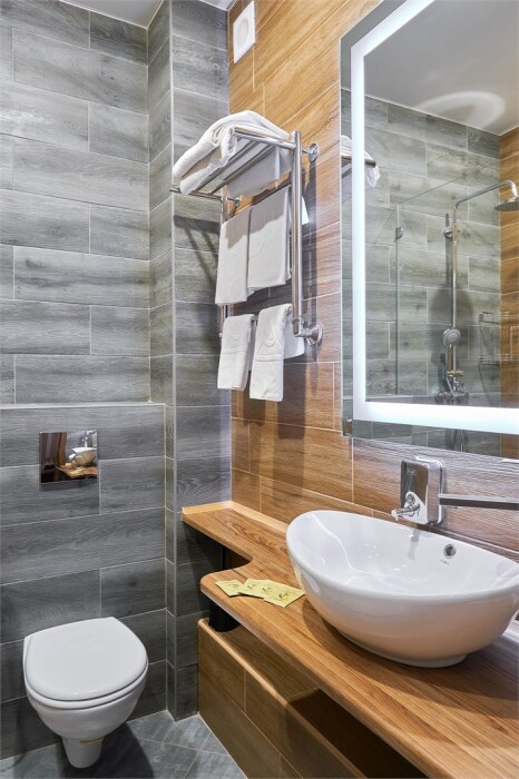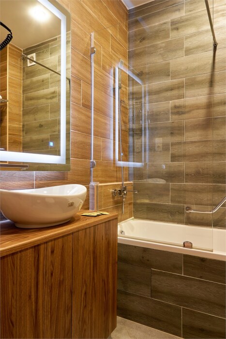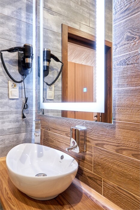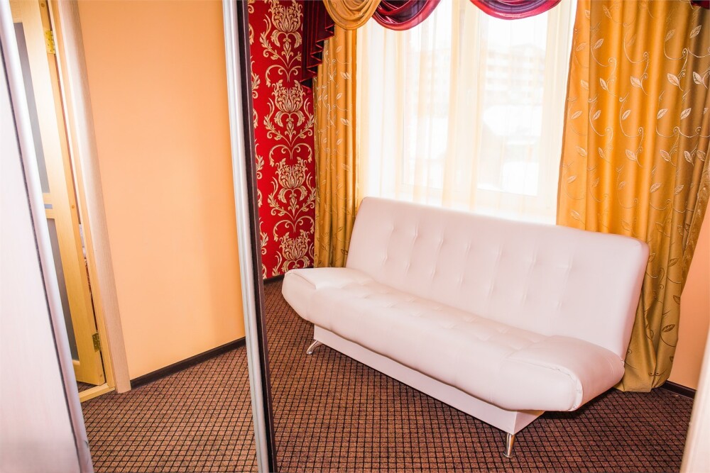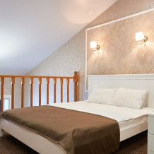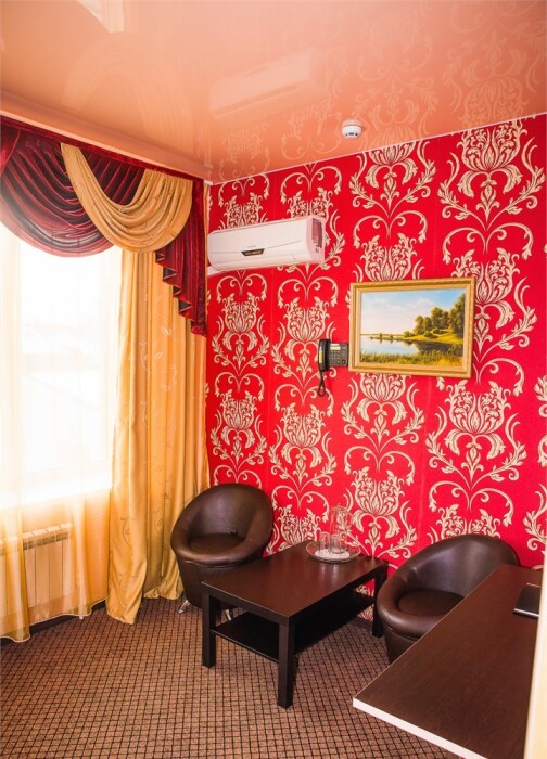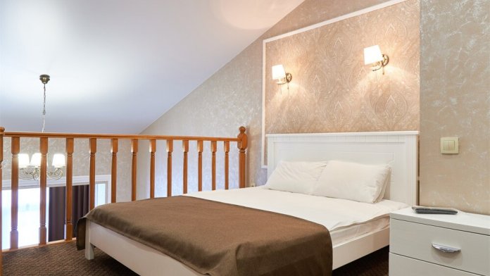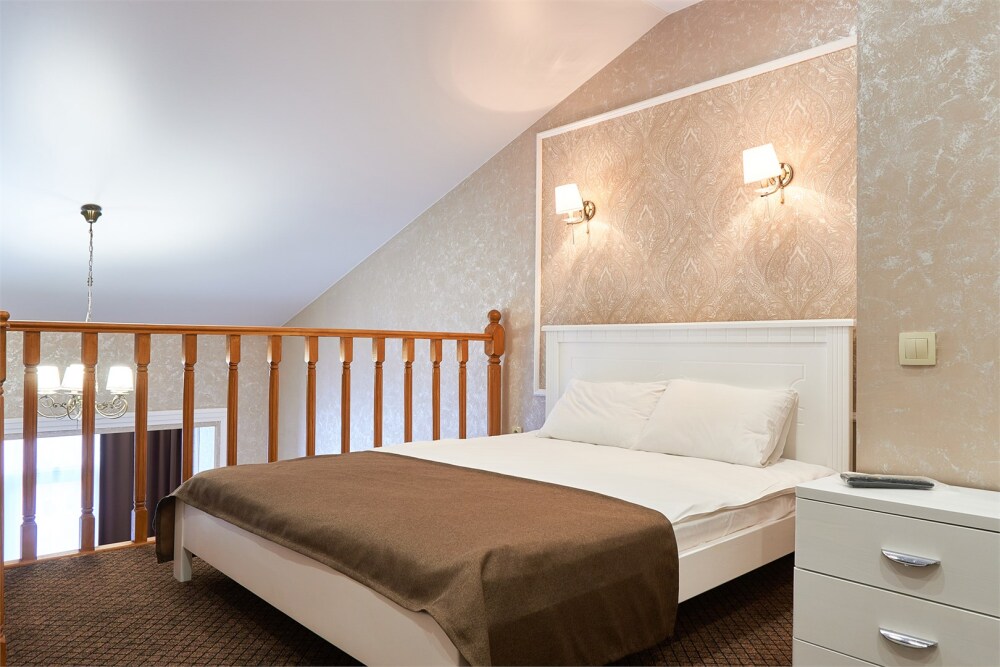 Просторный двухуровневый номер высшей категории с гостинной и спальней. Жилая площадь номера 30-35 м2. Большие окна.