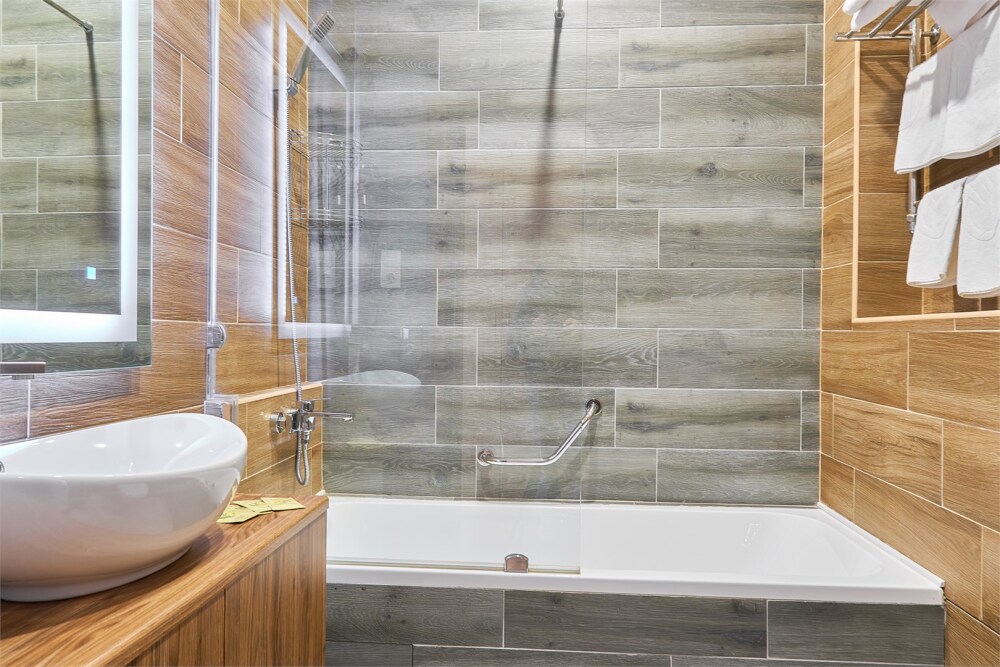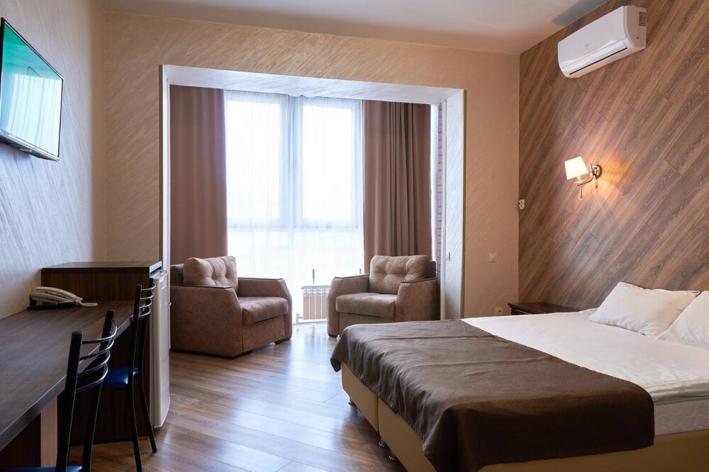 В номере: двуспальная кровать, прикроватная тумбочка, прикроватные светильники, журнальный столик, туалетный столик, удобный диван, шкаф-купе, телевизор, кабельное телевидение, телефон, кондиционер, wi-fi. Санузел, Душевая кабина, туалетные принадлежности, банные принадлежности.