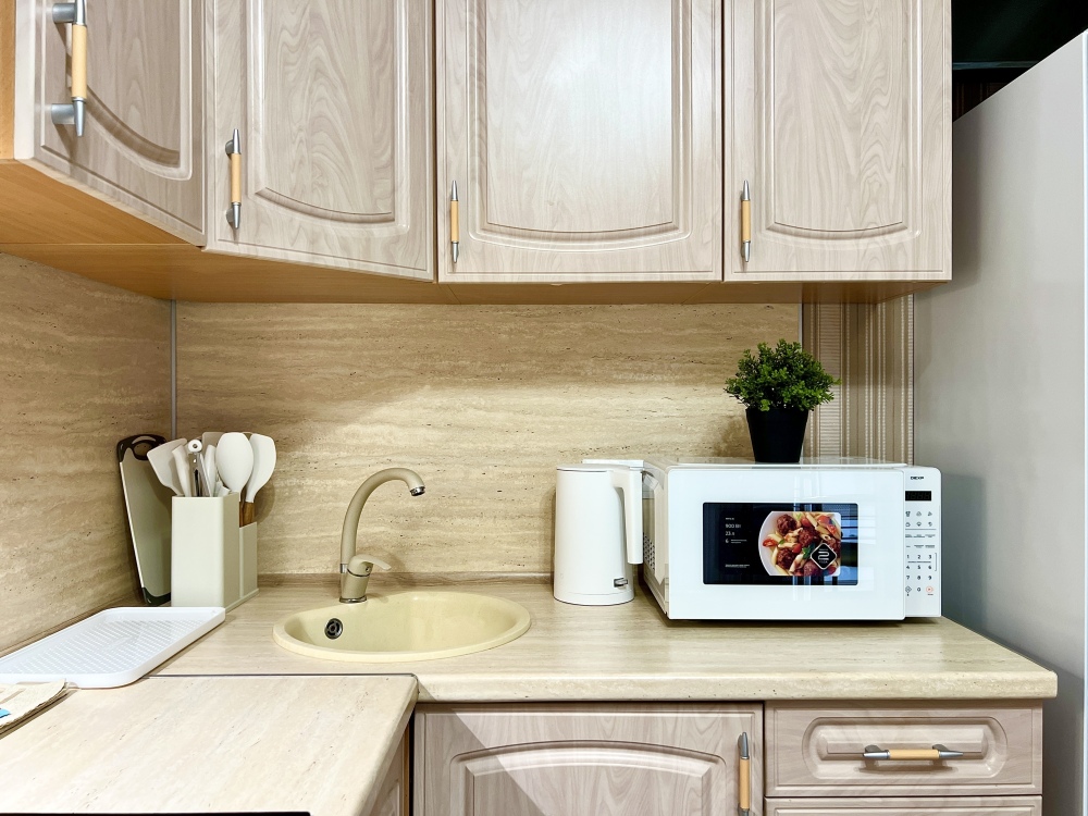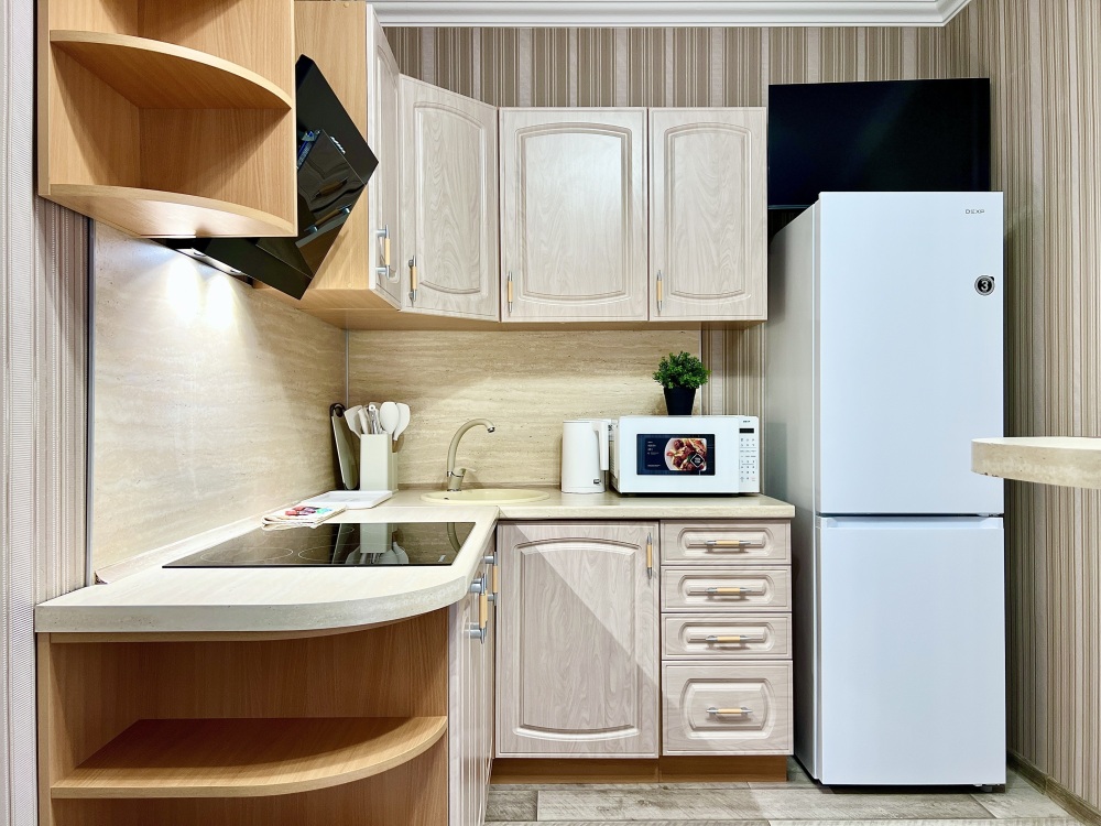 - Наши гости могут готовить на полностью оборудованной кухне с бытовой техникой и посудой, есть плита ,электрический чайник, микроволновая печь и холодильник;