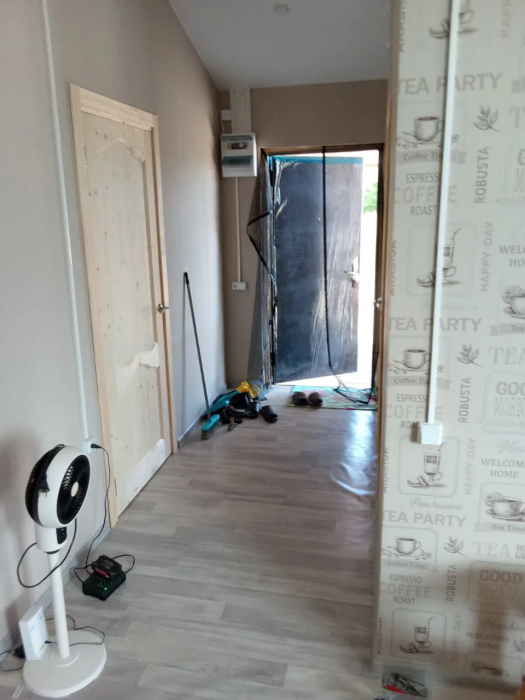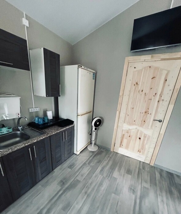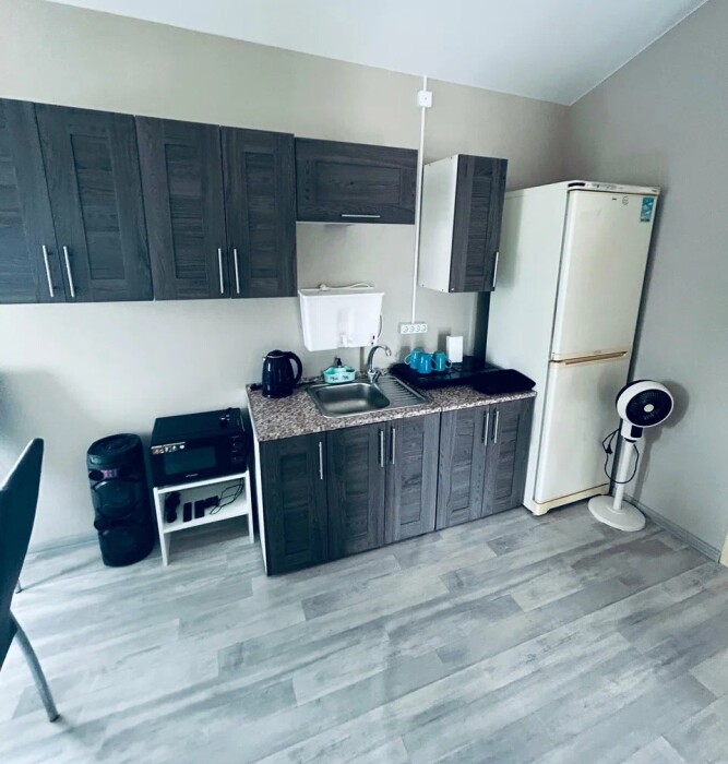 Бытовая техника: холодильник, индукциoнная плитa, микроволновка, телевизор, кулер, фен.