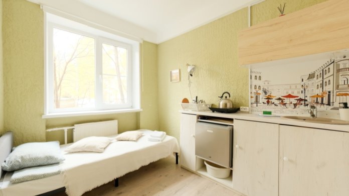 В каждой из студий есть индивидуальная мини кухня, собственный санузел с душевой, рабочая зона и удобное спальное место.