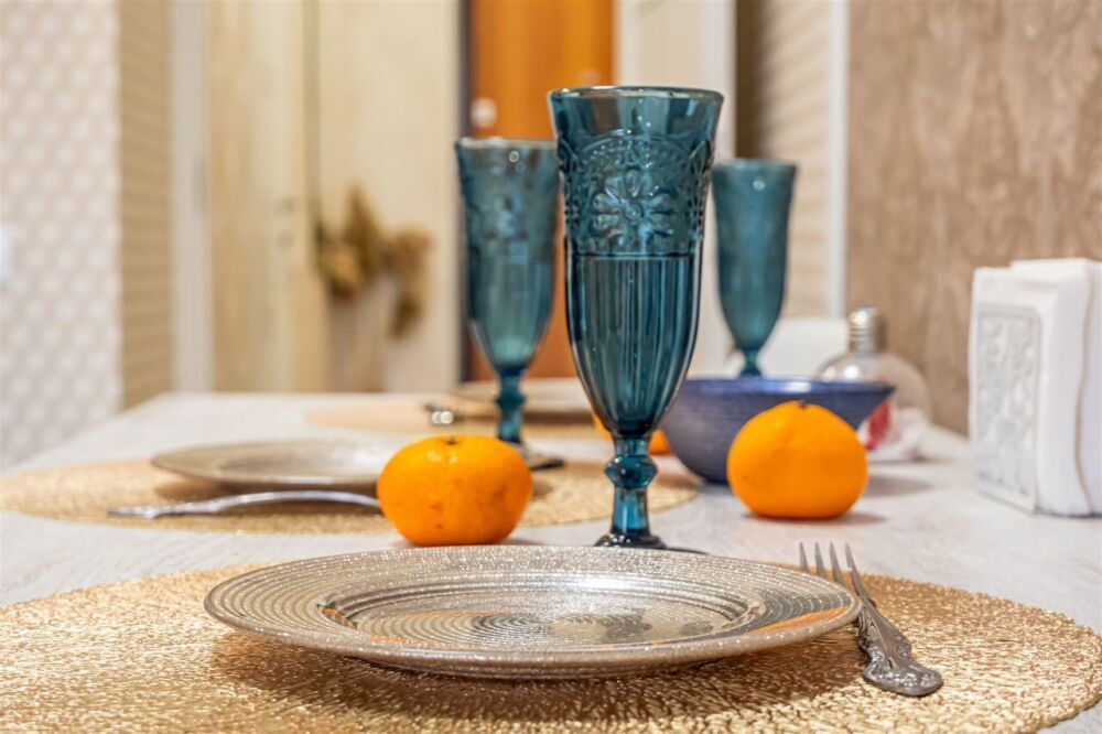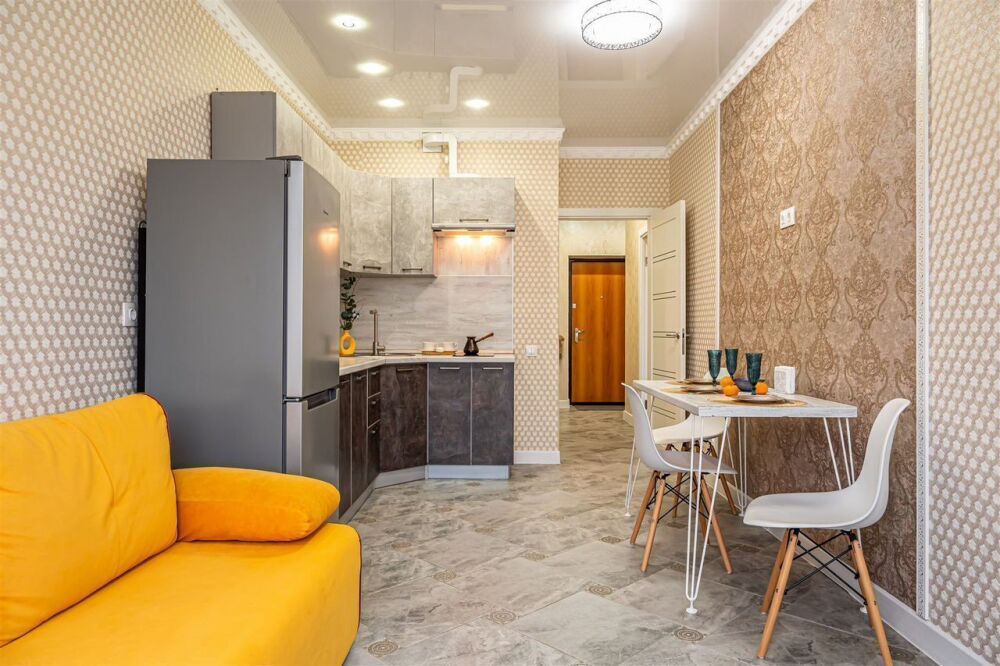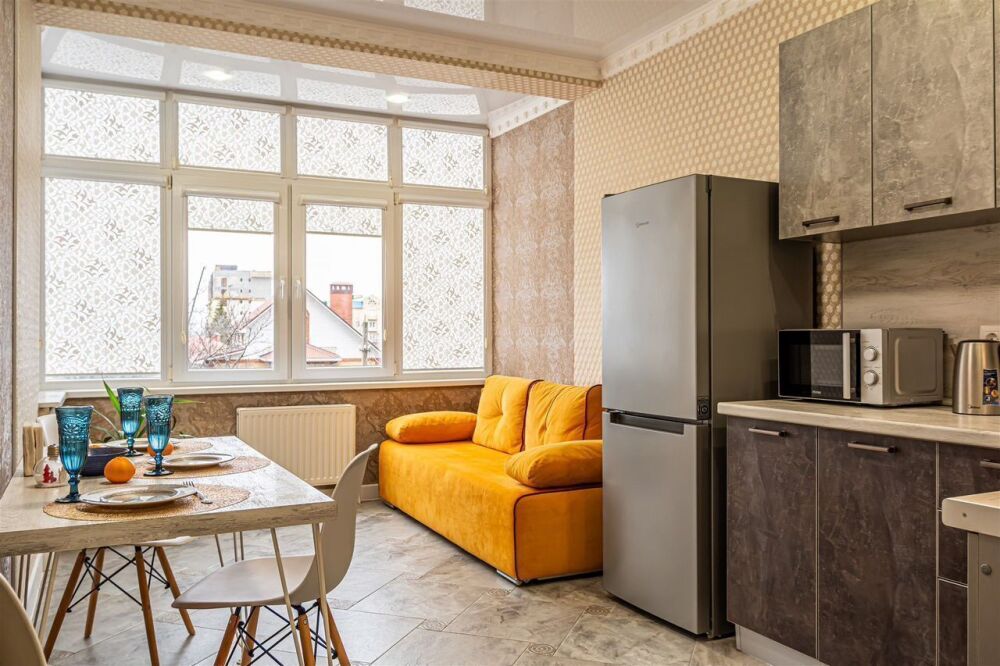 Внутри апартаментов Вы найдете просторную зону с мягким диваном для отдыха после насыщенного дня, полностью оборудованный кухонный уголок с бытовой техникой и посудой для приготовления любых блюд. Зона сна с удобной кроватью, мягкими качественными подушками и ортопедическим матрасом обеспечит Вам комфортный сон. Ванная комната оснащена всем необходимым.