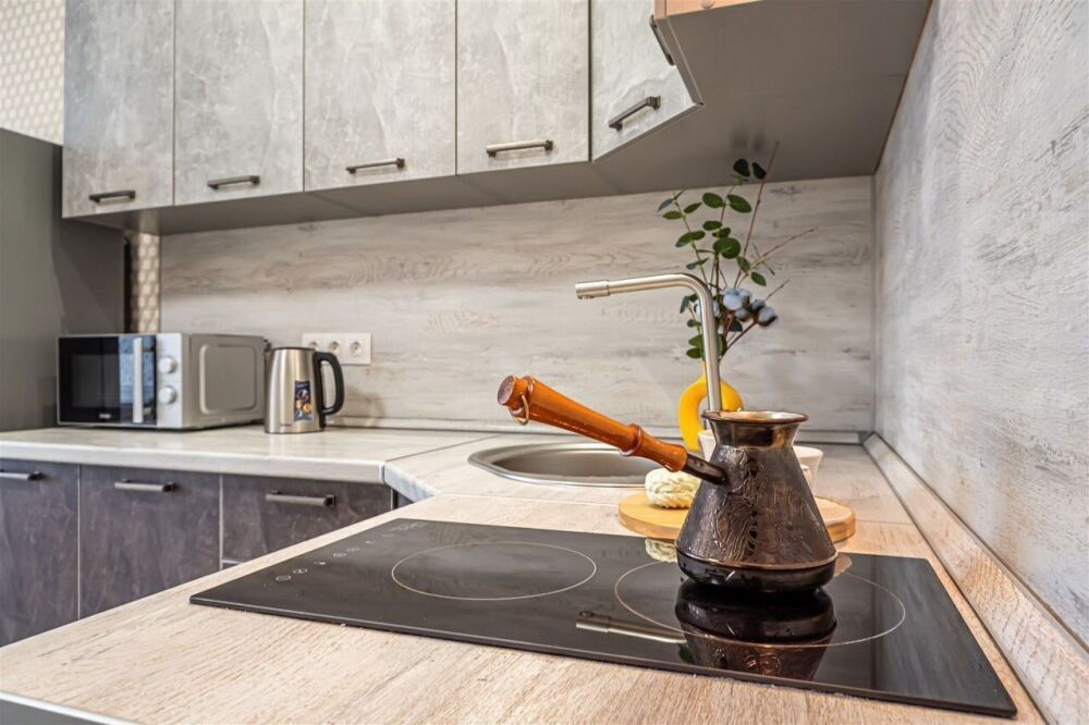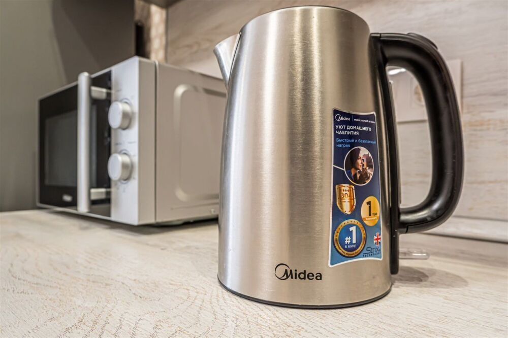 - холодильник, микроволновка, варочная панель, электрический чайник;