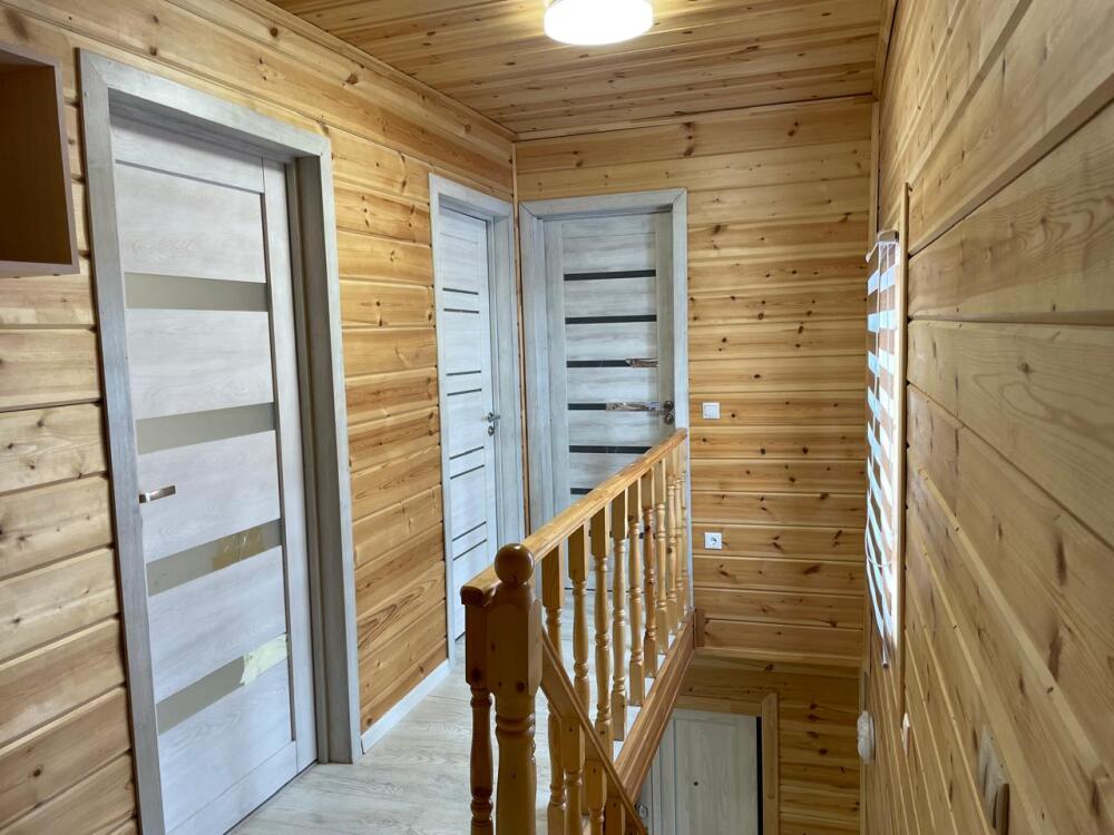 Двухэтажный дом расположен в Подмосковье в 25 кМ от МКАД. Деревянный коттедж в скандинавском стиле оборудован всеми удобствами и коммуникациями: электричество, отопление, горячее и холодное водоснабжение, система водоотведения. На первом этаже расположена гостевая, смежная с кухней. На втором этаже две спальные комнаты с выходом на балконы. Санузел - на обоих этажах.