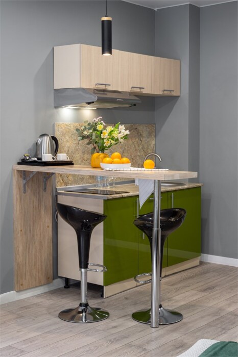 В номере: двуспальная кровать, прикроватные тумбочки, стол, стулья, шкаф ЖК-телевизор, кондиционер, телефон, сейф, мини-кухня, электрический чайник, микроволновая печь, электрическая варочная панель, мини-бар, душ, туалет, фен, отопление, звукоизоляция, кухонные принадлежности, туалетно-косметические принадлежности, постельное белье, полотенца, тапочки, вешалки для одежды, подключение к кабельному и цифровому телевидению, доступ к беспроводной сети WI-FI.
