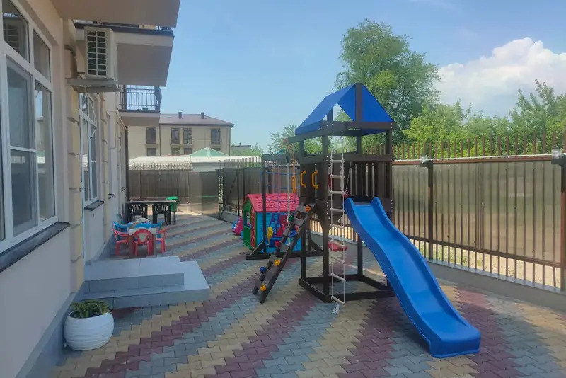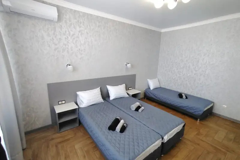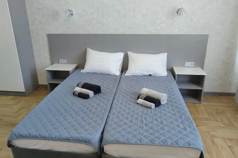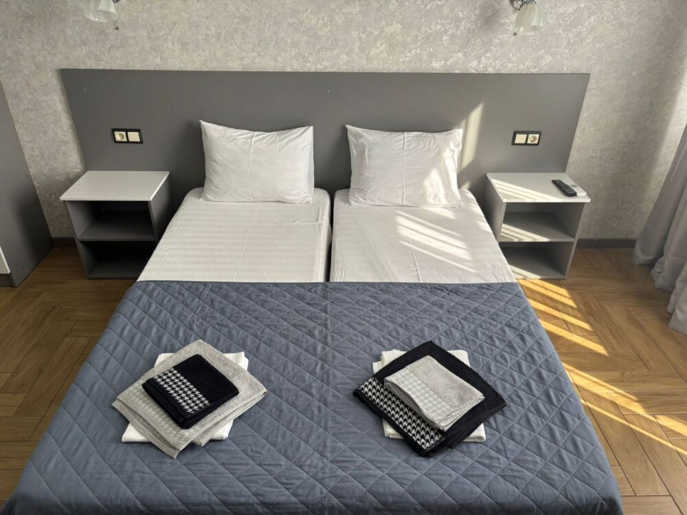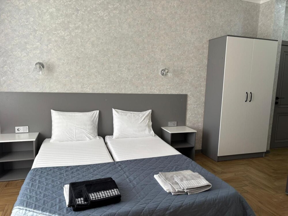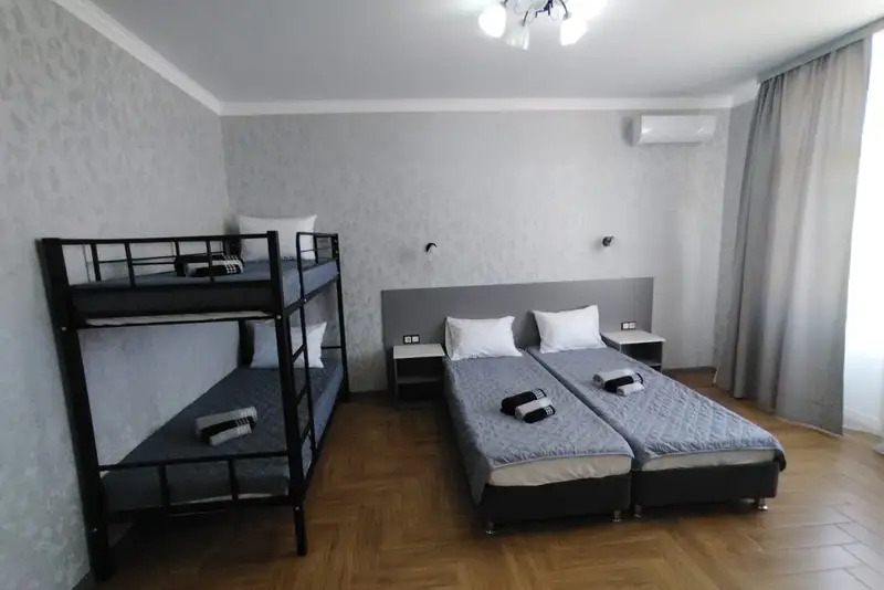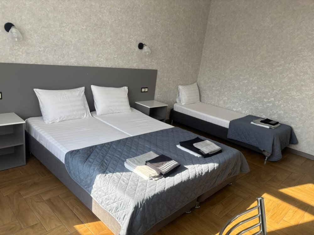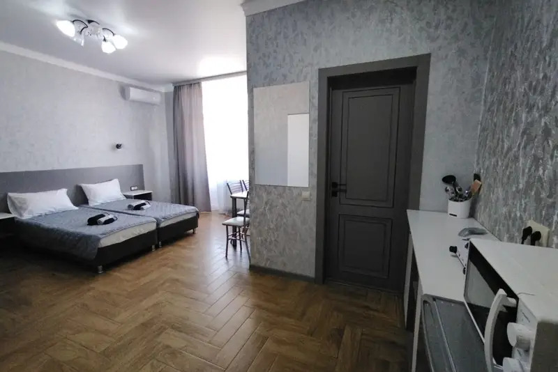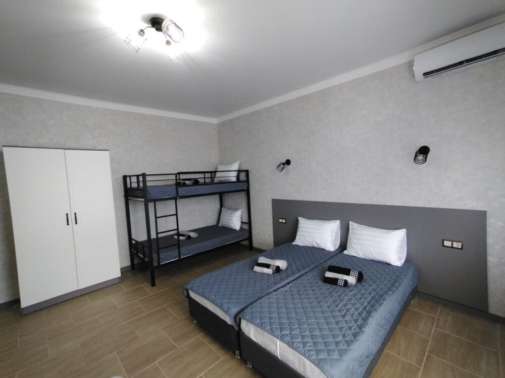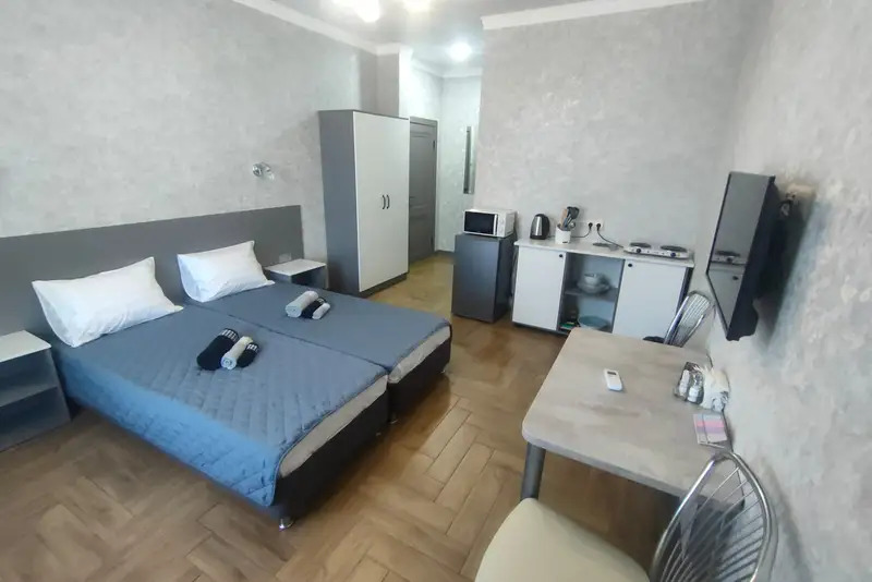 Номера-студии с мини-кухней, санузлом. На территории имеются: подогреваемый бассейн, детская площадка, спортивный уголок, место с мангалом.