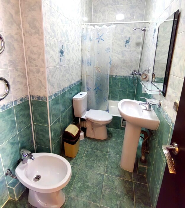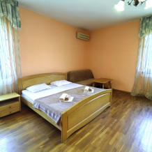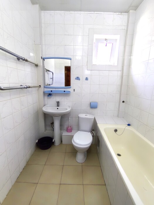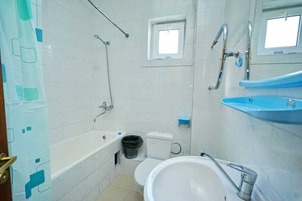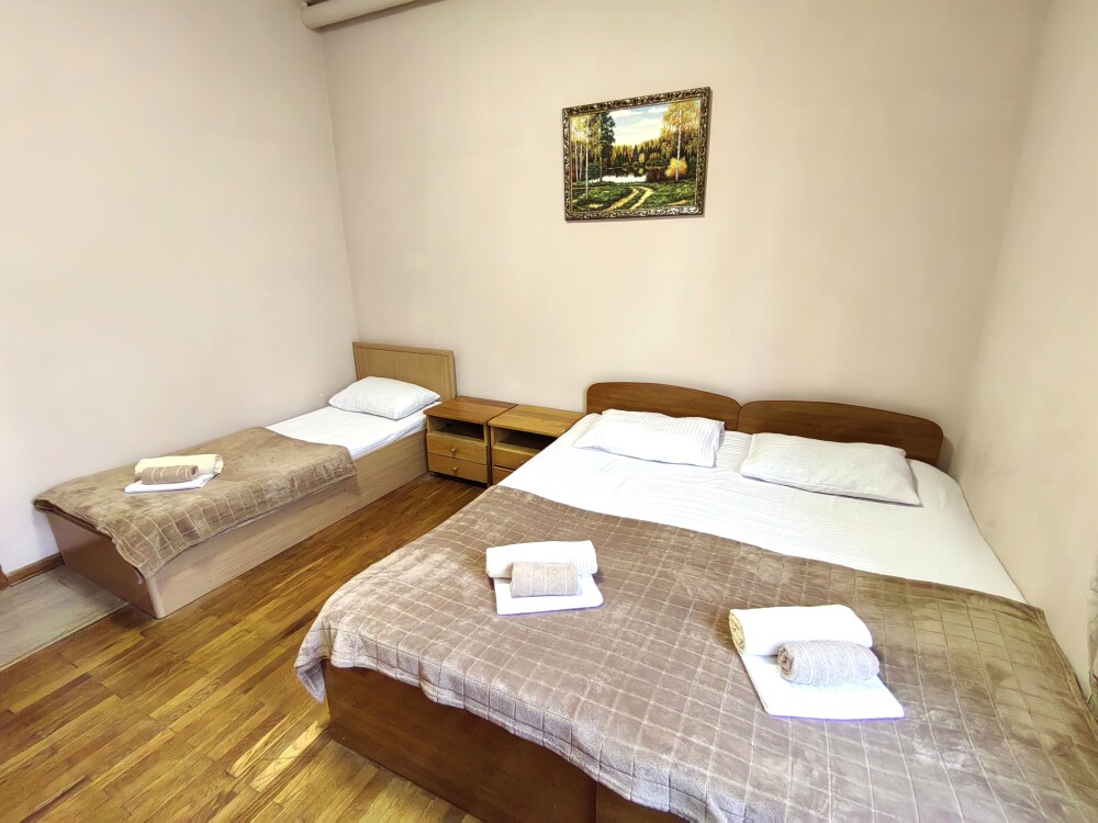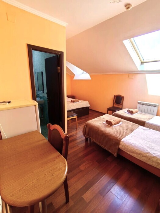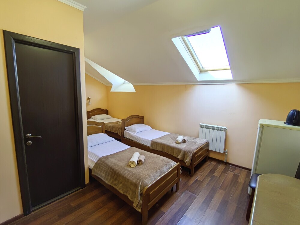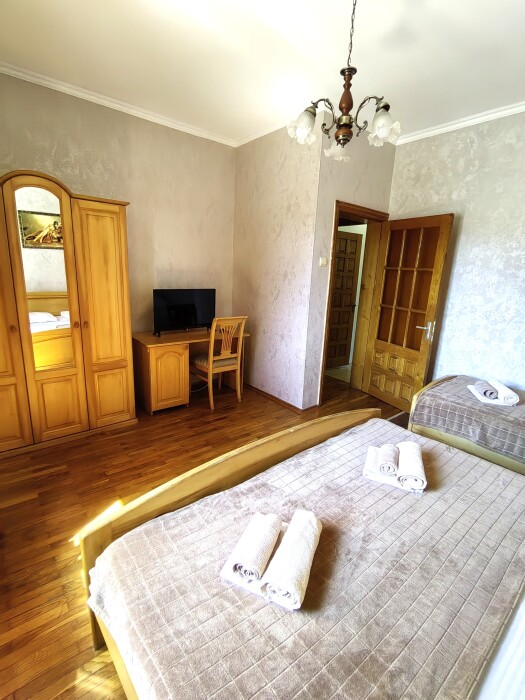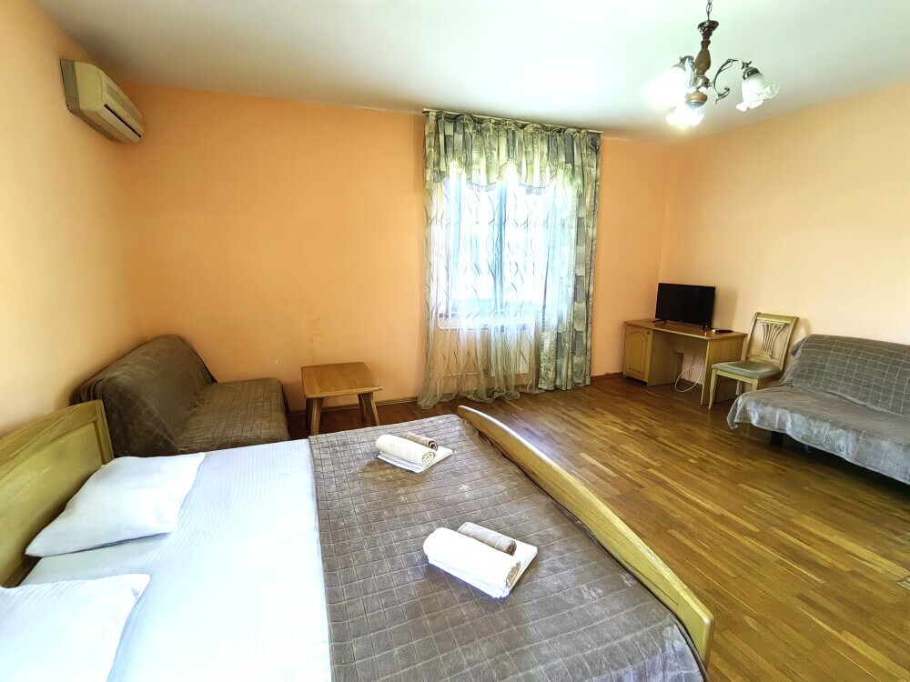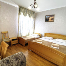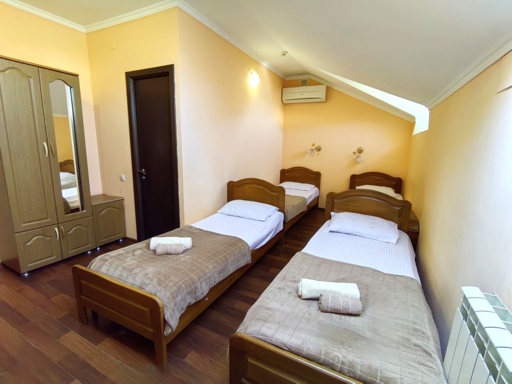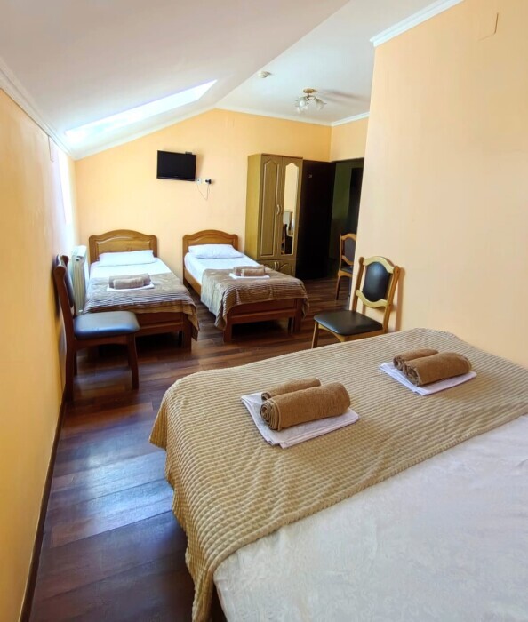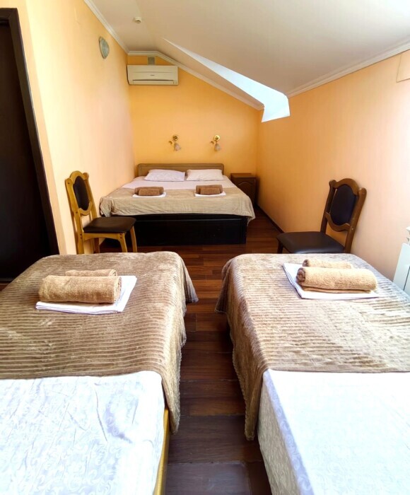 Комфортный номер с размещением до 5 гостей. В номере: телевизор, холодильник, кондиционер, Wi-Fi, стол, стулья, шкаф и санузел, душ, ванна. Постельное бельё, пледы и полотенца предоставляются. Чайник, гладильная доска и утюг на этаже.