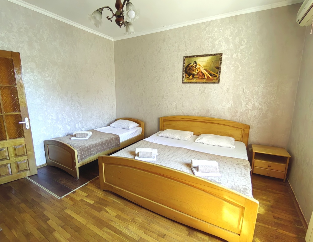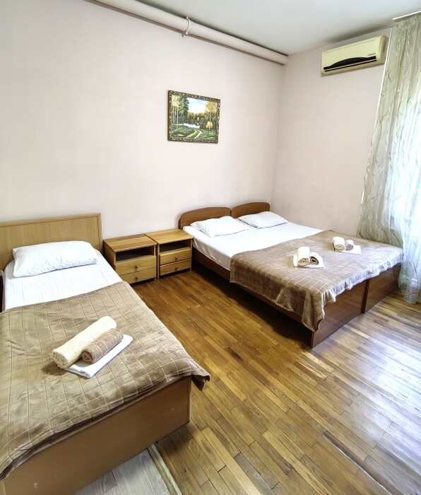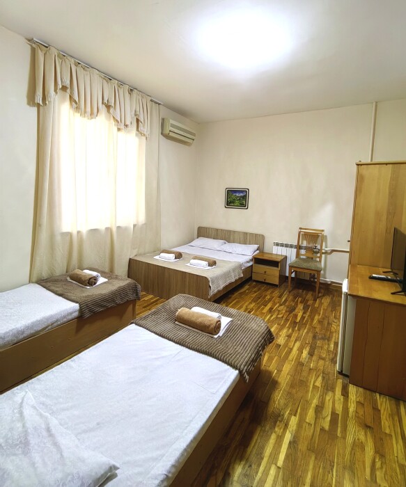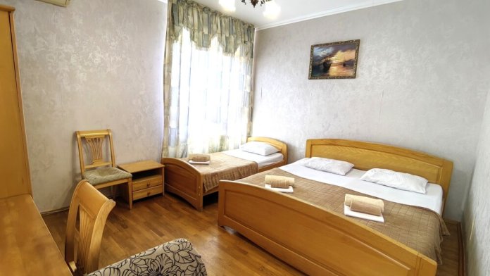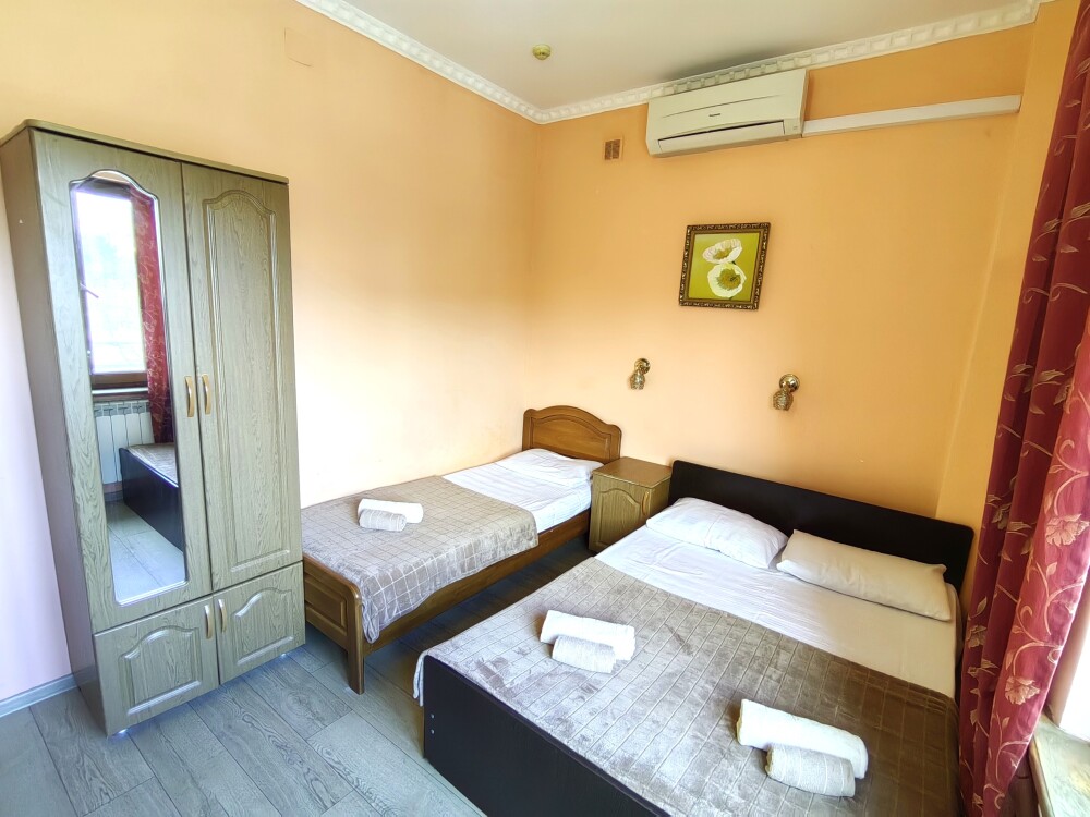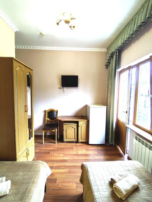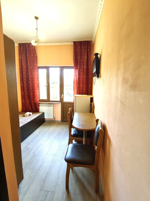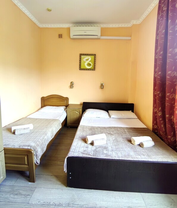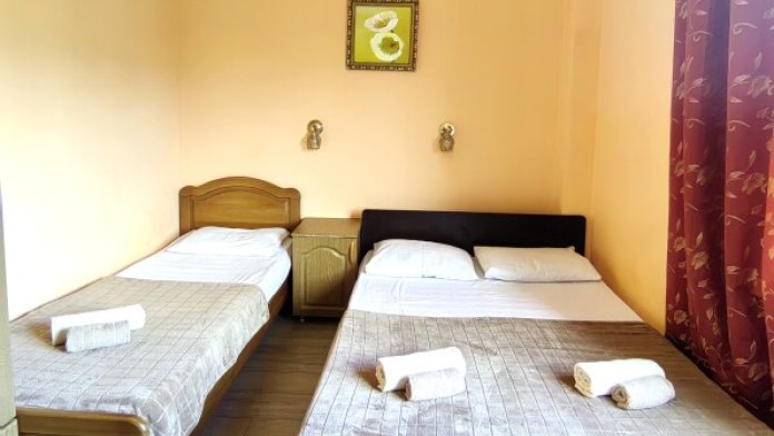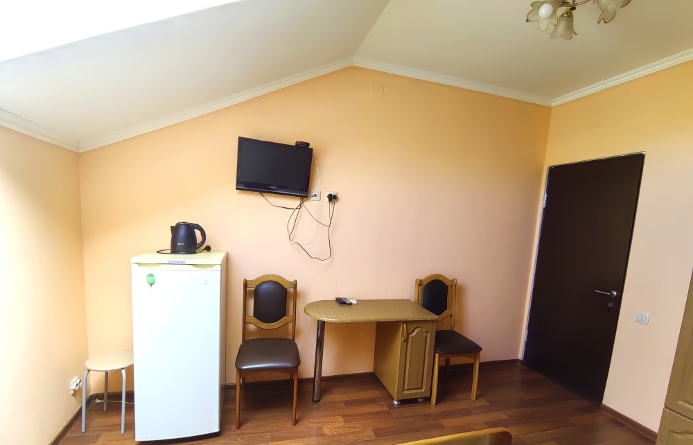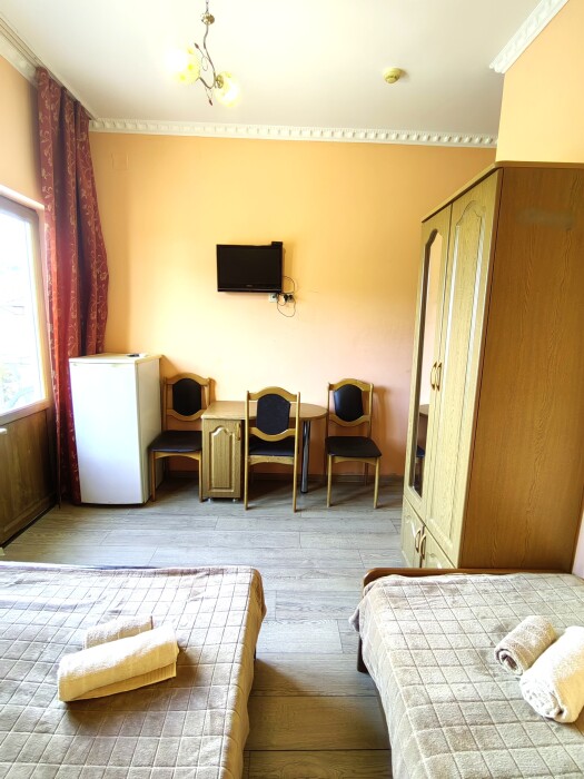 Комфортный номер с размещением до 3 гостей. В номере: телевизор, холодильник, кондиционер, Wi-Fi, стол, стулья, шкаф и санузел, душ и балкон. Постельное бельё, пледы и полотенца предоставляются. Чайник, гладильная доска и утюг на этаже.