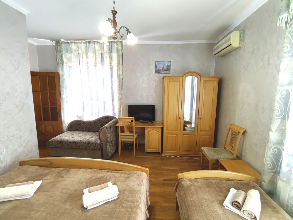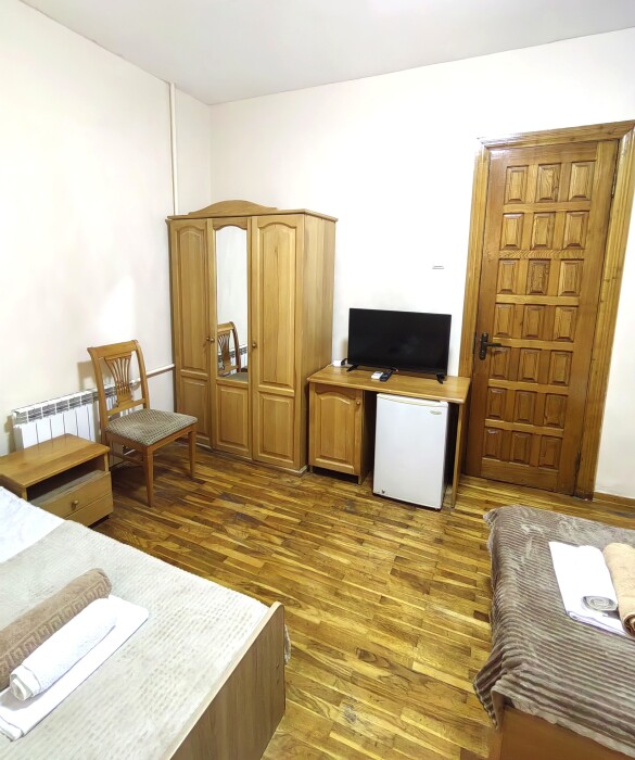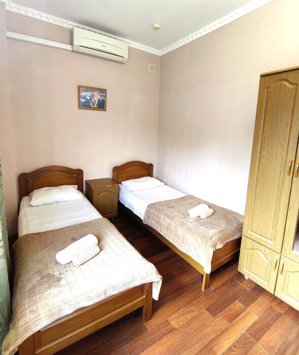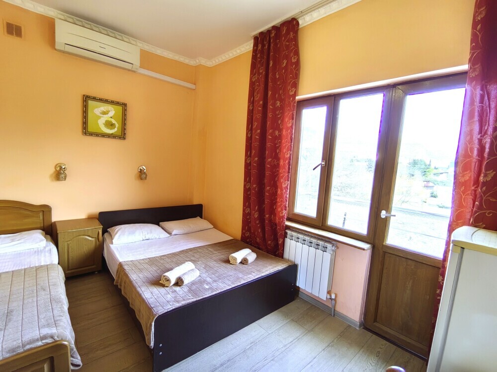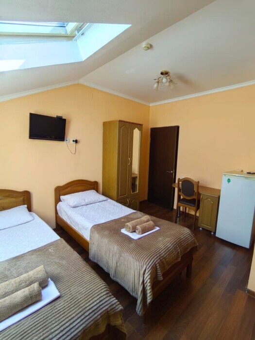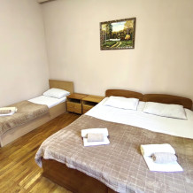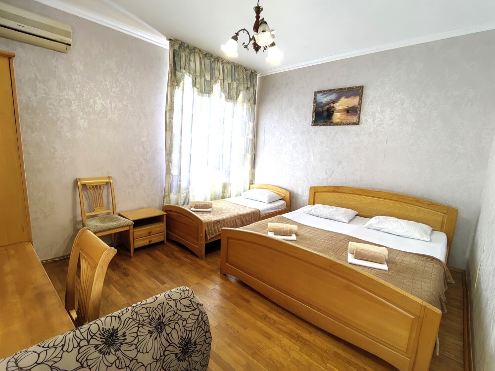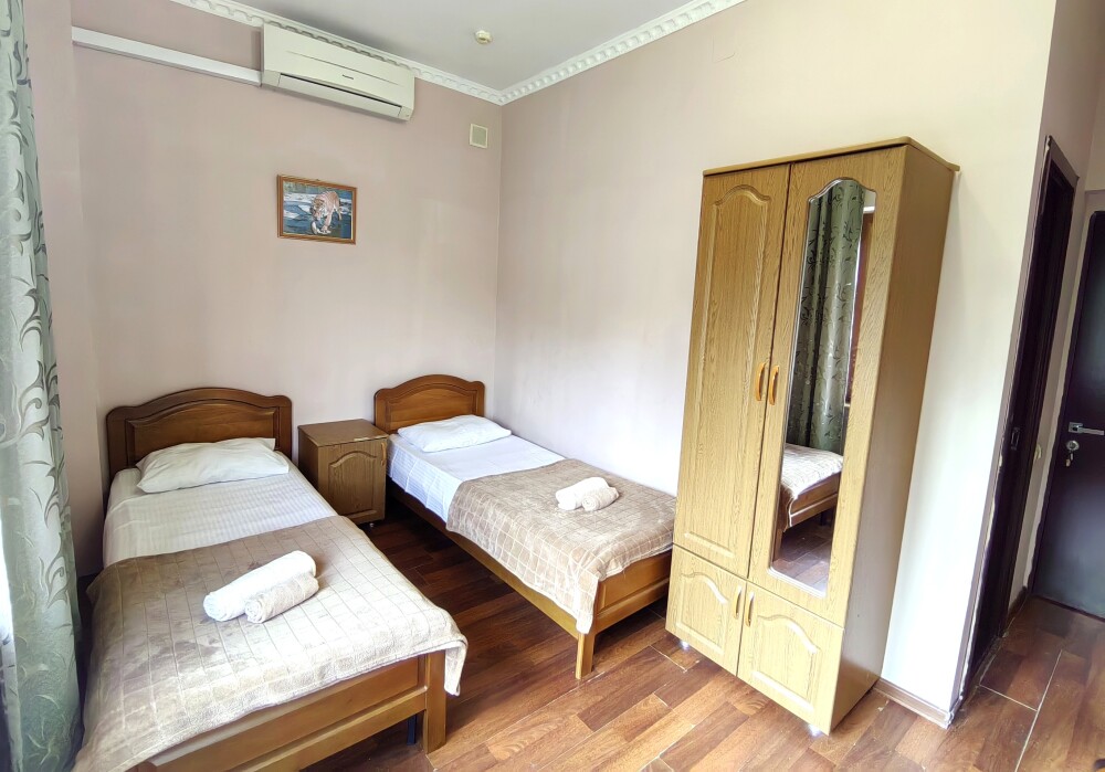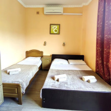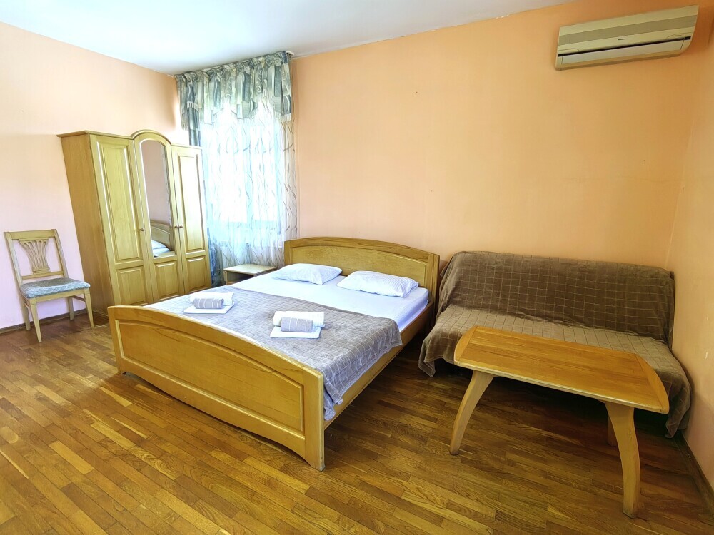Комфортный номер с размещением до 3 гостей. В номере: телевизор, холодильник, кондиционер, Wi-Fi, стол, стулья, шкаф и санузел, душ и балкон. Постельное бельё, пледы и полотенца предоставляются. Чайник, гладильная доска и утюг на этаже.