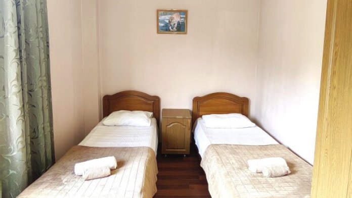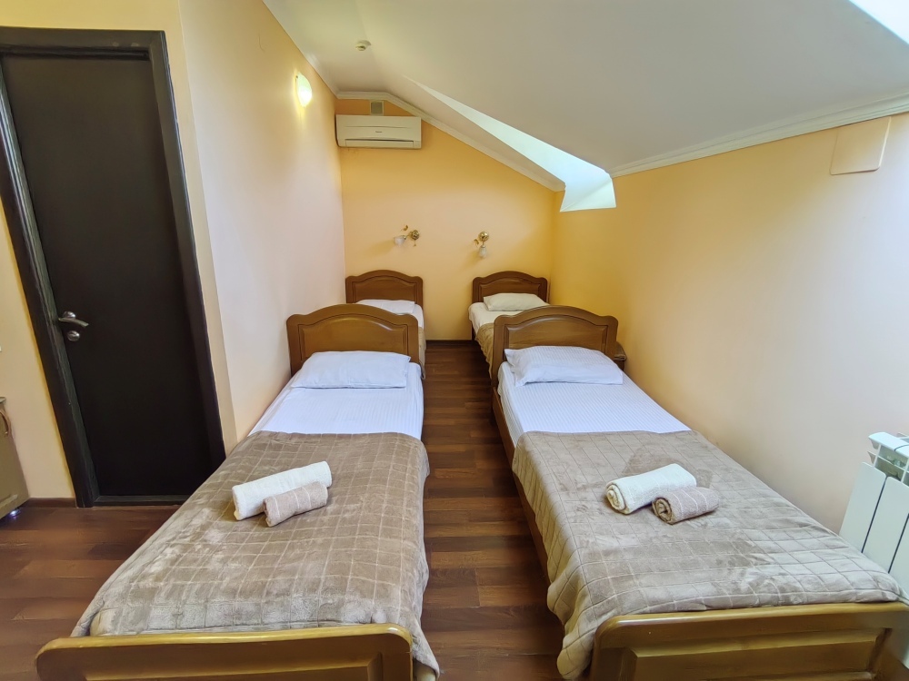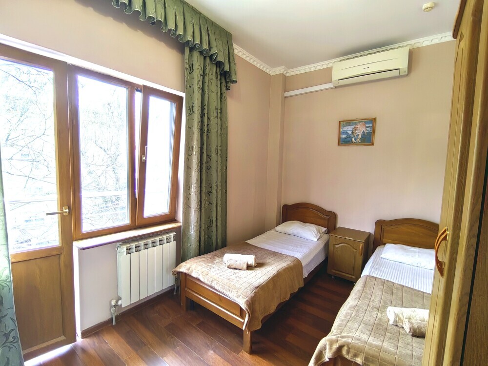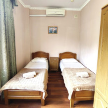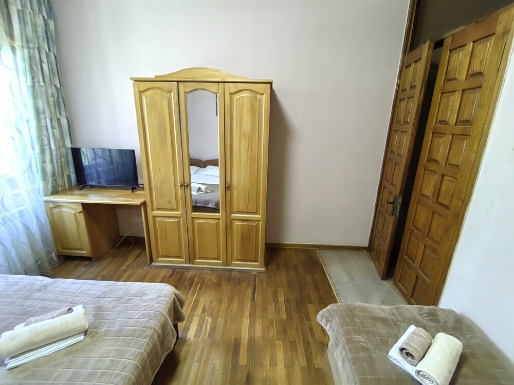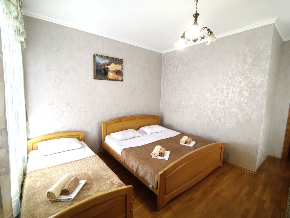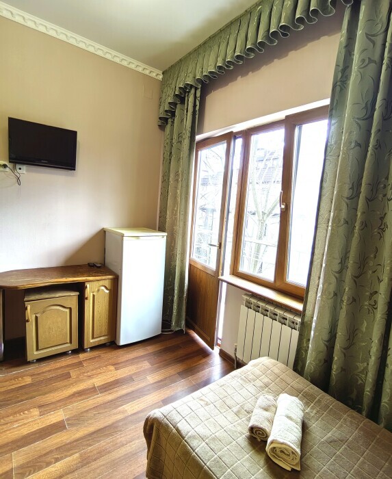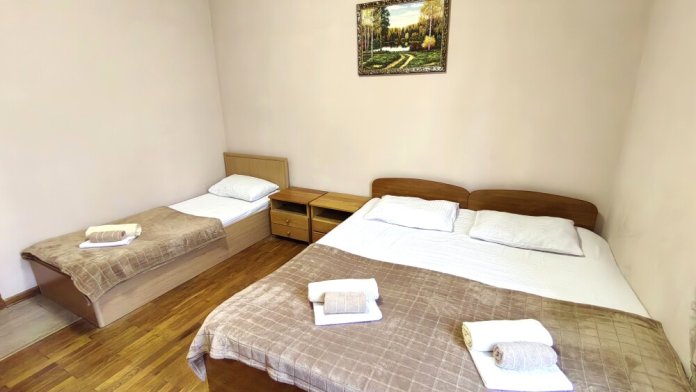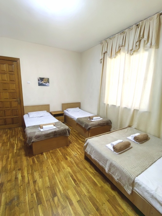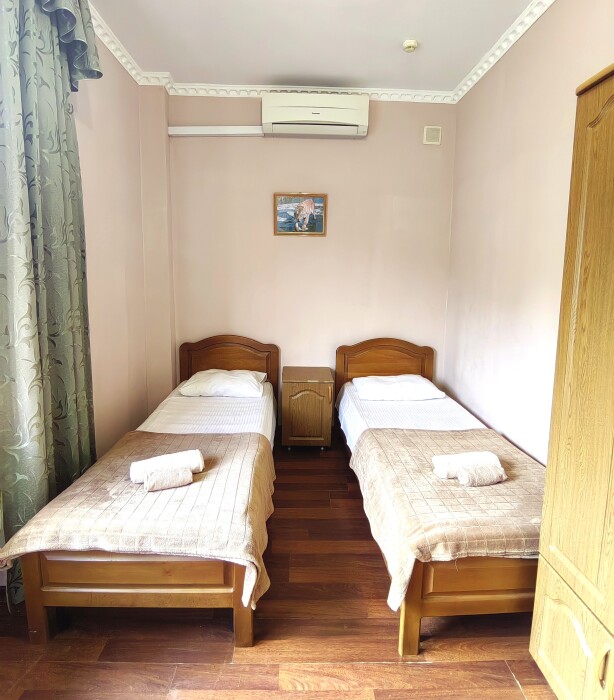 Комфортный номер с размещением до 3 гостей. В номере: телевизор, холодильник, кондиционер, Wi-Fi, стол, стулья, шкаф и санузел, душ и балкон. Постельное бельё, пледы и полотенца предоставляются. Чайник, гладильная доска и утюг на этаже.