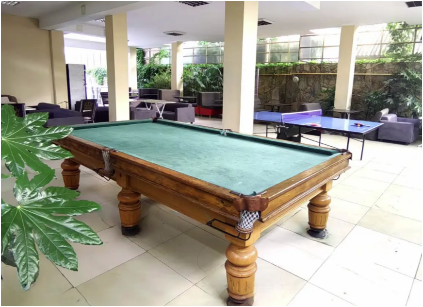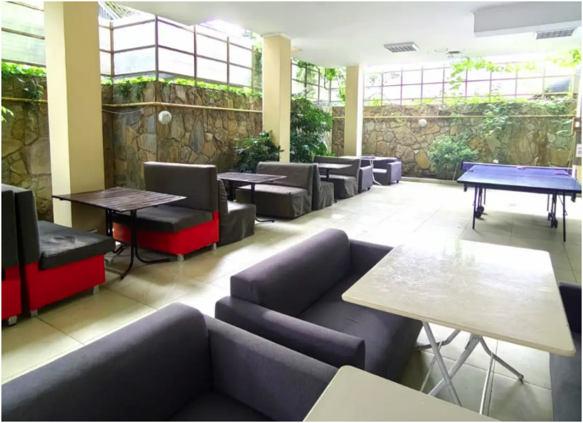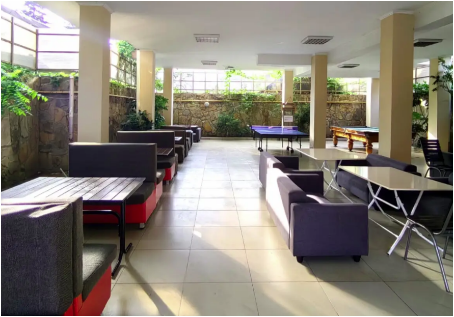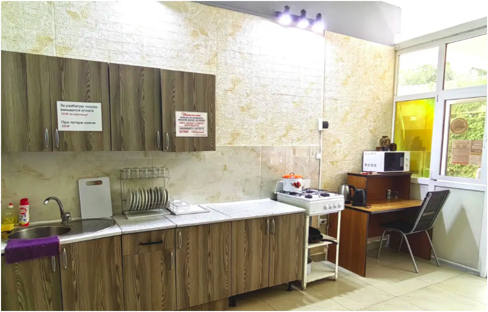 На первом этаже общая оборудованная кухня. Во дворе дома зона отдыха, каркасный бассейн с шезлонгами. Настольный теннис и бильярд (доп. плата). Зона барбекю. На территории дома есть кафе.