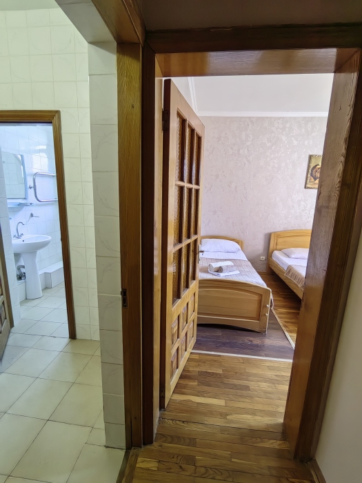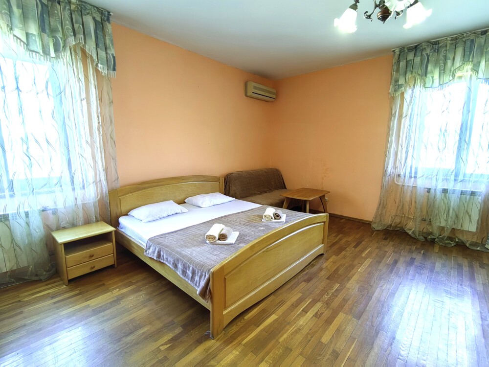 Комфортный 2-комнатный номер с размещением до 5 гостей. В номере: 2 комнаты, 2 телевизора, холодильник, кондиционер, Wi-Fi, стол, стулья, шкаф и санузел. Постельное бельё, пледы и полотенца предоставляются. Чайник, гладильная доска и утюг на этаже.