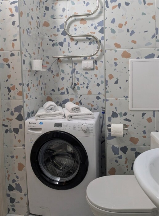 Ванная комната - отдельная история уюта: стиральная машина, фен и все необходимые принадлежности для вашего удобства.