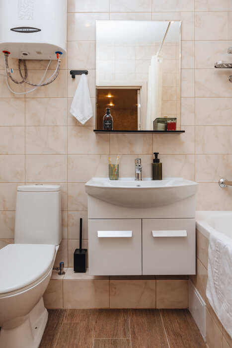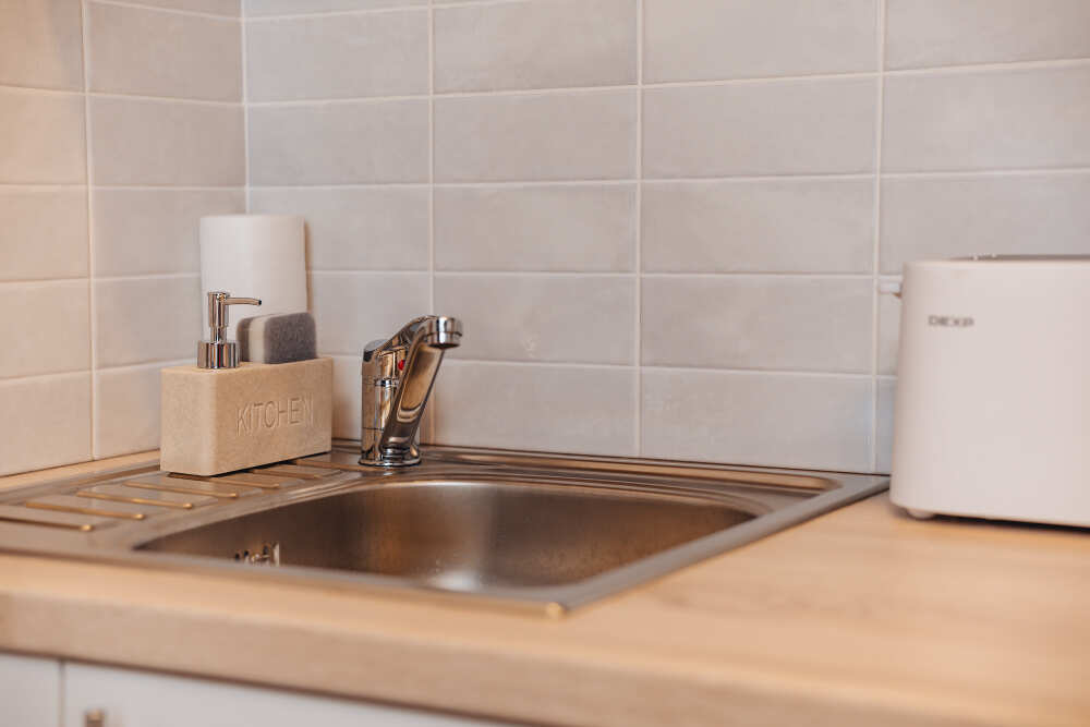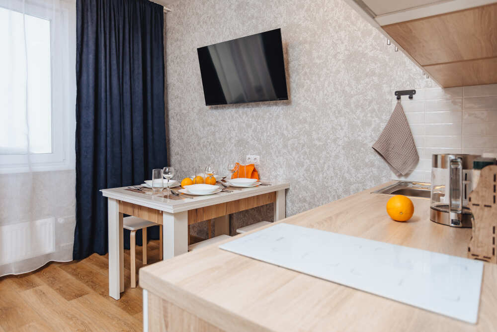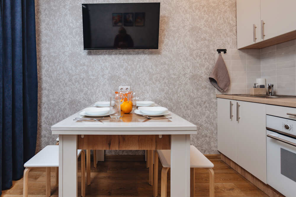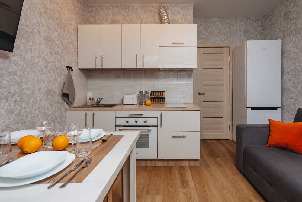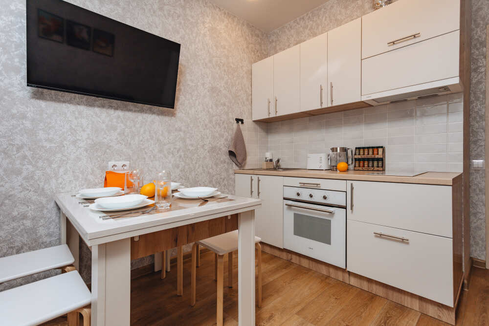 В квартире есть все, что может понадобиться для приготовления еды. Также есть вся посуда для комфортного проживания: ножи, столовые приборы на 4 человек, кастрюли, сковородки, тарелки, бокалы и многое другое включено, если снять квартиру у нас.