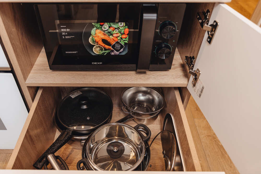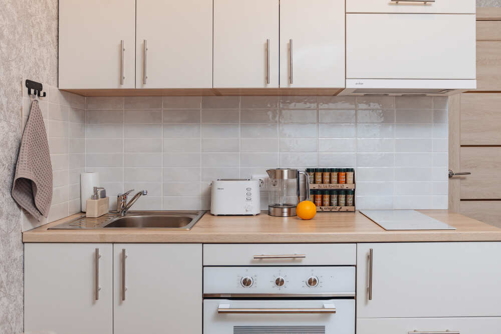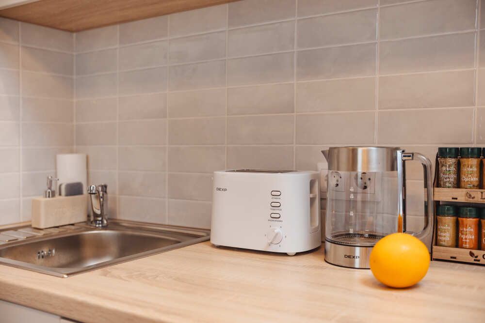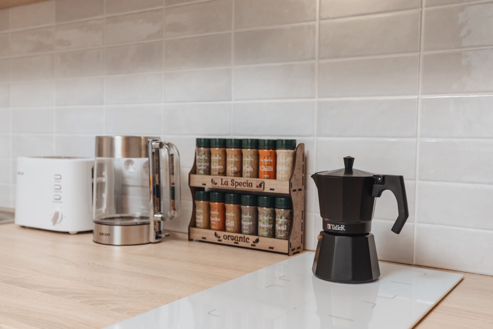 - Холодильник, варочная поверхность, тостер, микроволновка, чайник и гейзерная кофеварка.