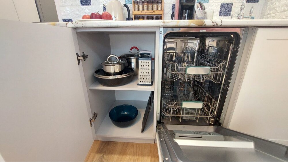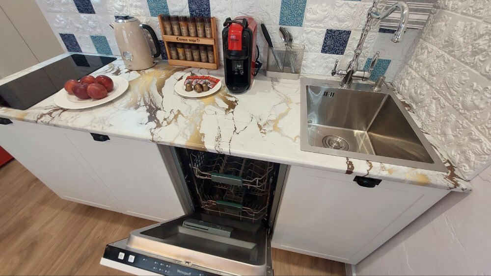 - Холодильник, посудомоечная машина, варочная поверхность, стиральная машина, микроволновка, чайник и капсульная кофемашина.