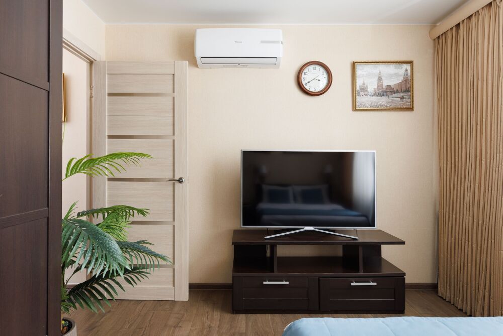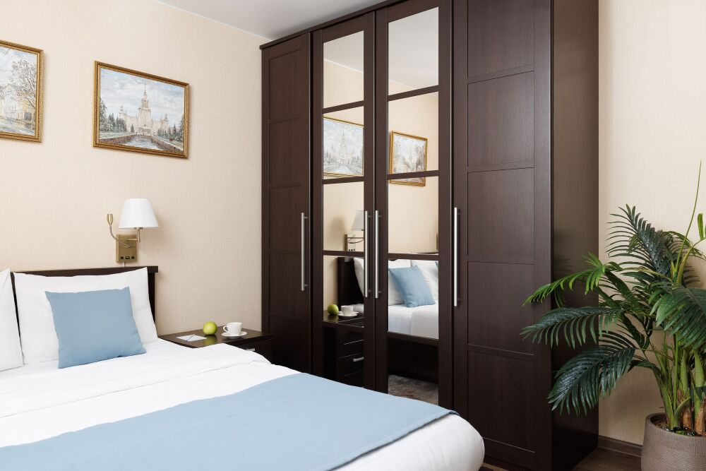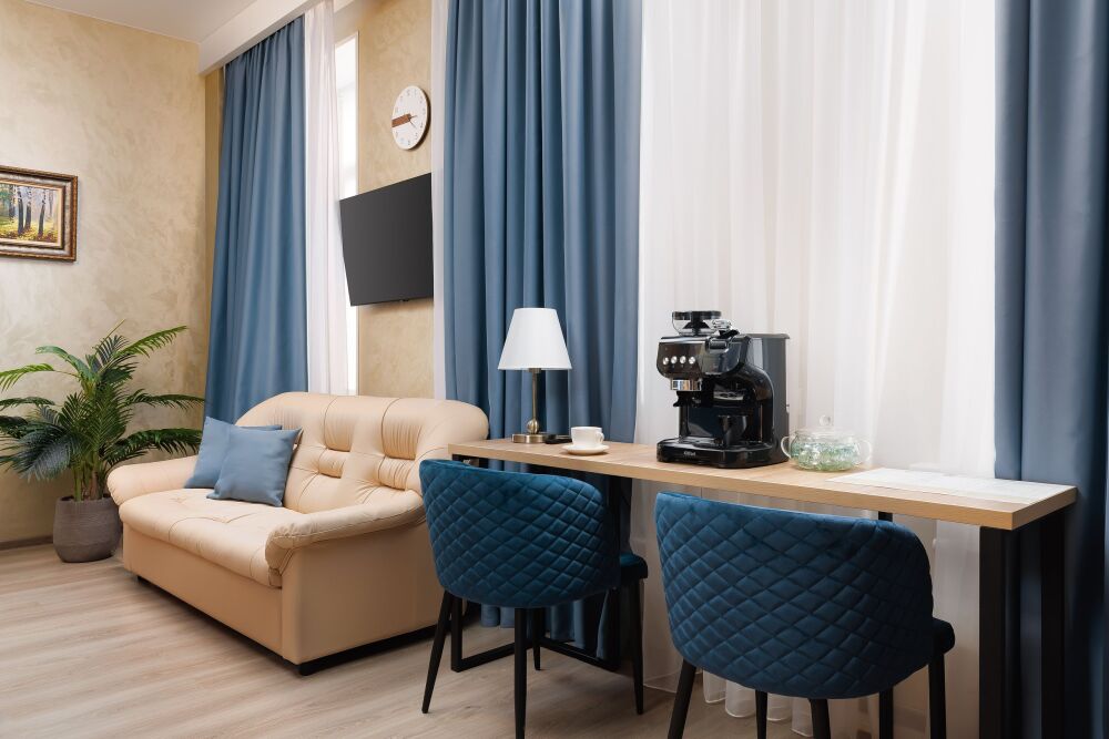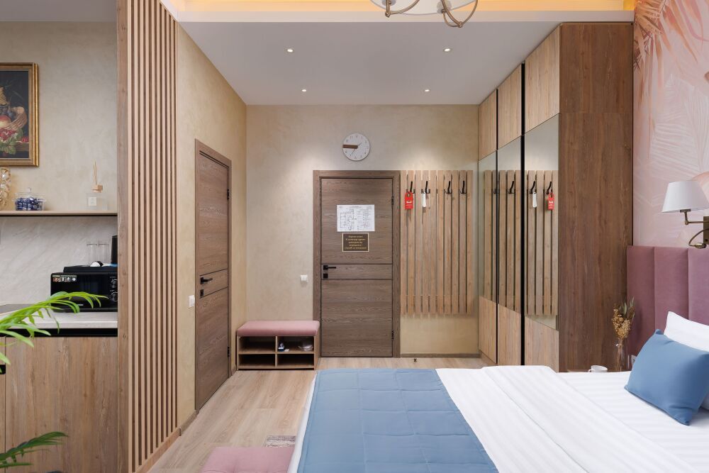 Номер-студия без кухни, с санузлом. В номере: двуспальная кровать с ортопедическим матрасом (можно сделать раздельные кровати), прикроватные тумбы, телевизор, шкаф для одежды, стол и стулья, холодильник, кофемашина, электрический чайник.