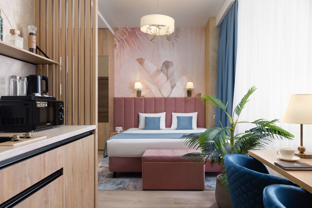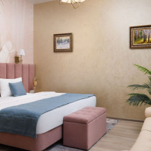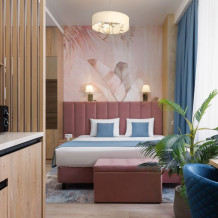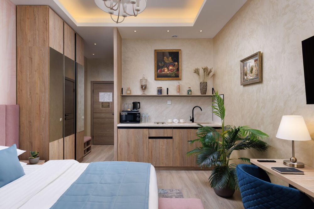 Номер с собственной ванной комнатой и мини-кухней. Наполнение номера: двуспальная кровать с ортопедическим матрасом, прикроватные тумбы, шкаф для одежды, стол и стулья, телевизор. На кухне есть плита для приготовления еды, холодильник, электрический чайник, кофемашина и необходимый набор посуды для двух человек.