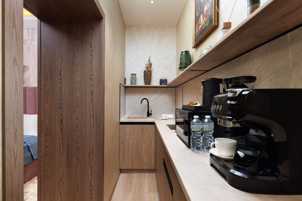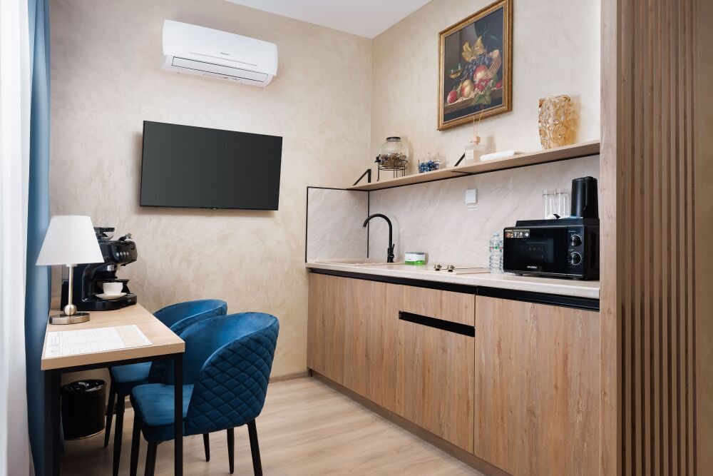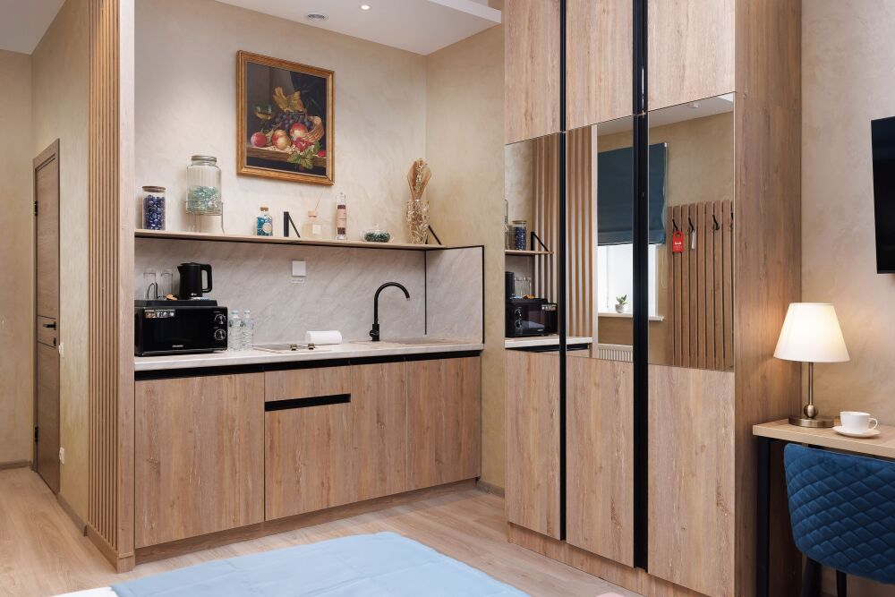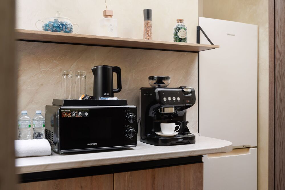 Во всех номерах, кроме категории Бизнес, есть мини-кухня с холодильником, варочной плитой, электрическим чайником, кофемашиной и набором посуды, необходимым для комфортного проживания.