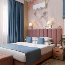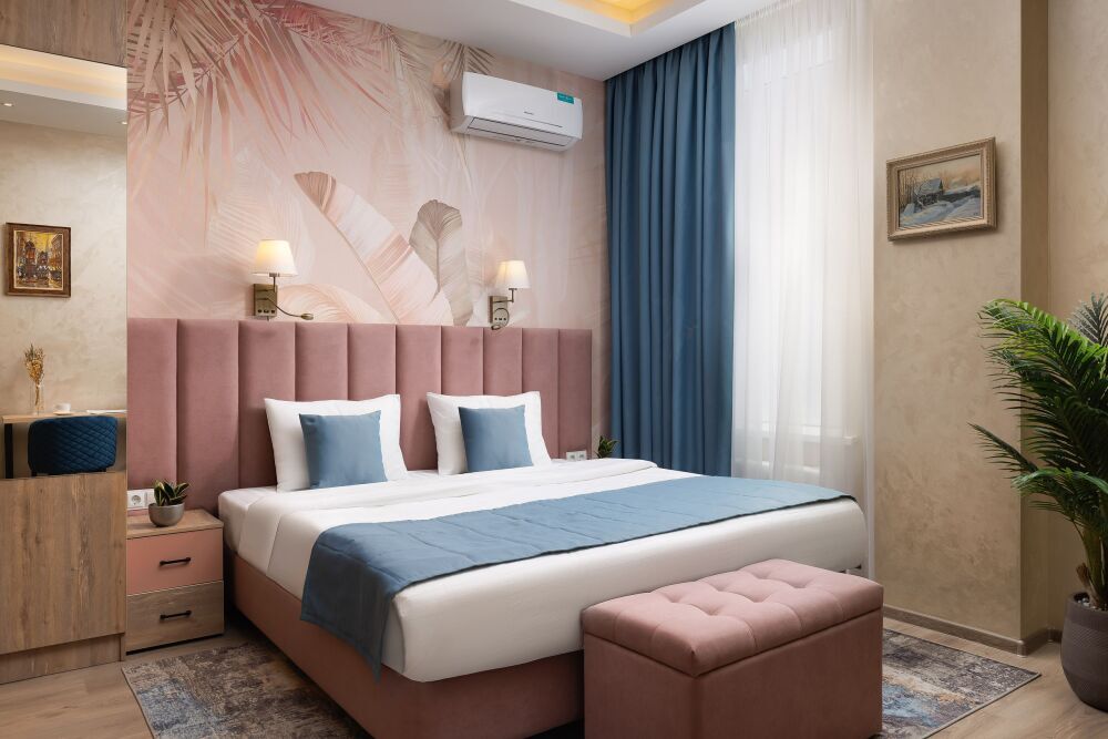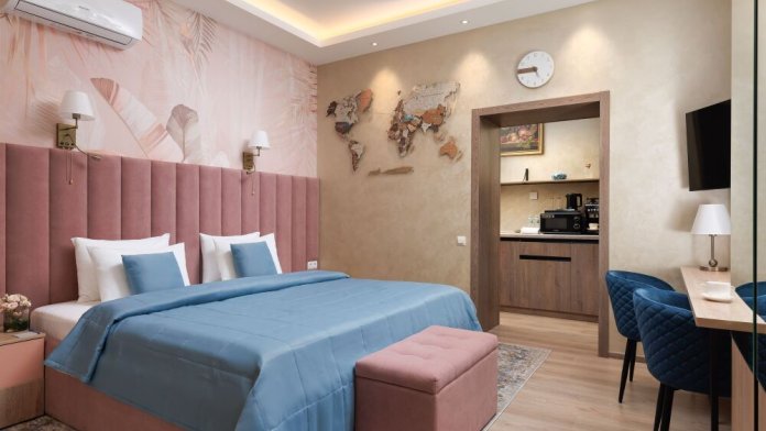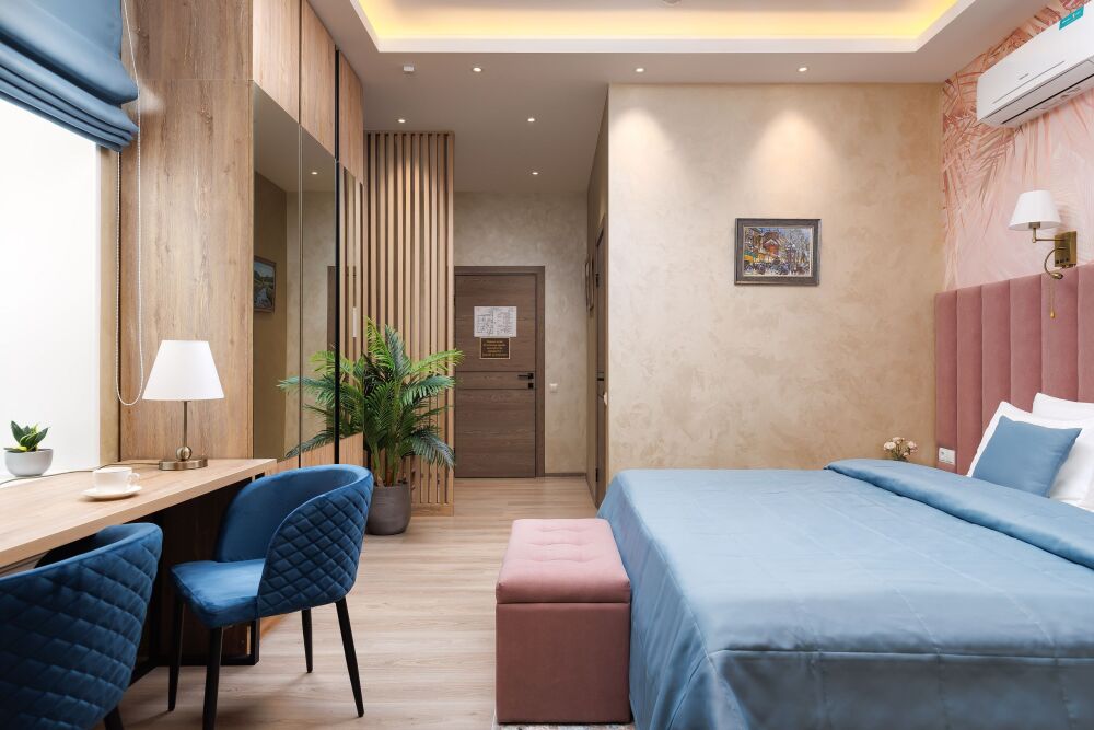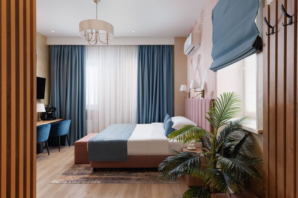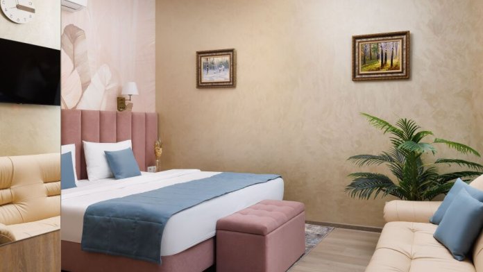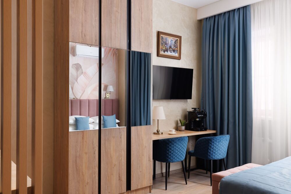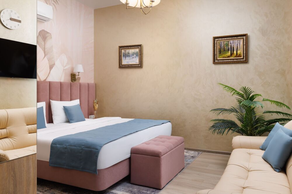 В каждом номере выполнен дизайнерский ремонт в спокойной цветовой гамме, чтобы отдых в отеле был приятным и расслабляющим.