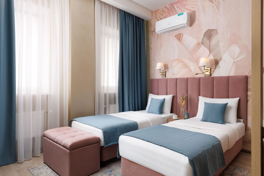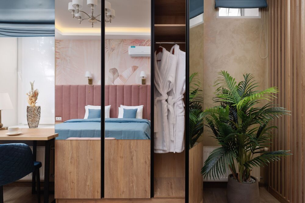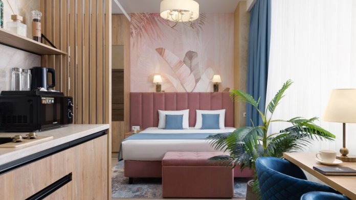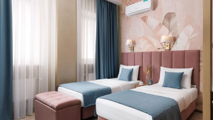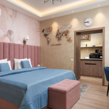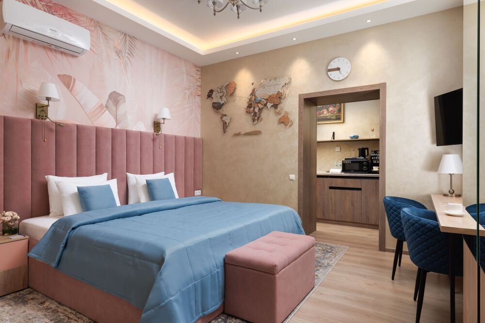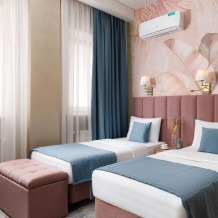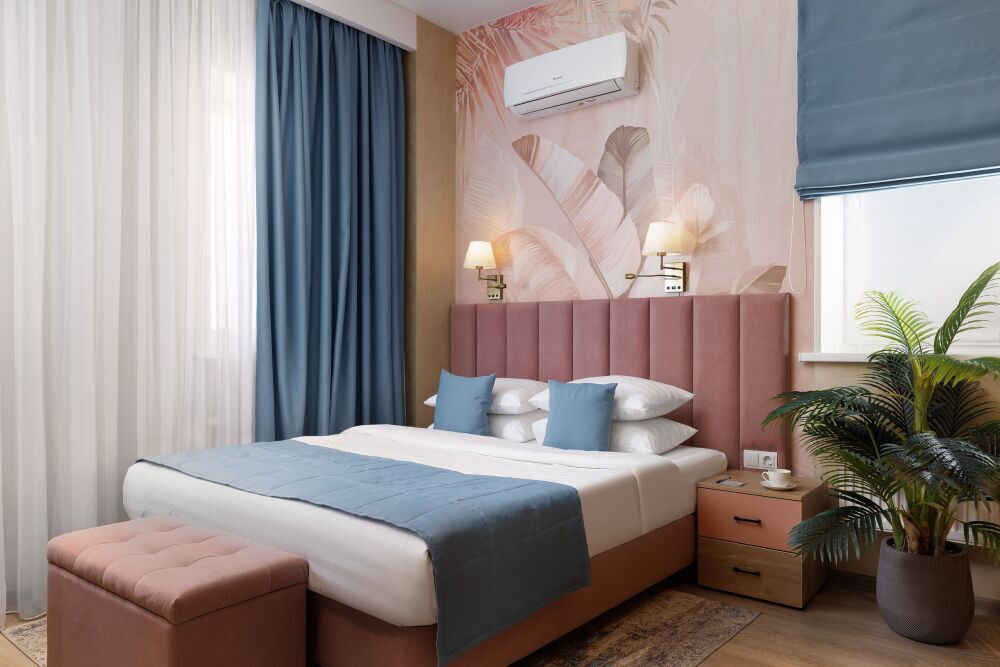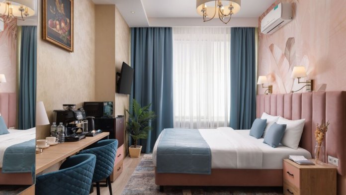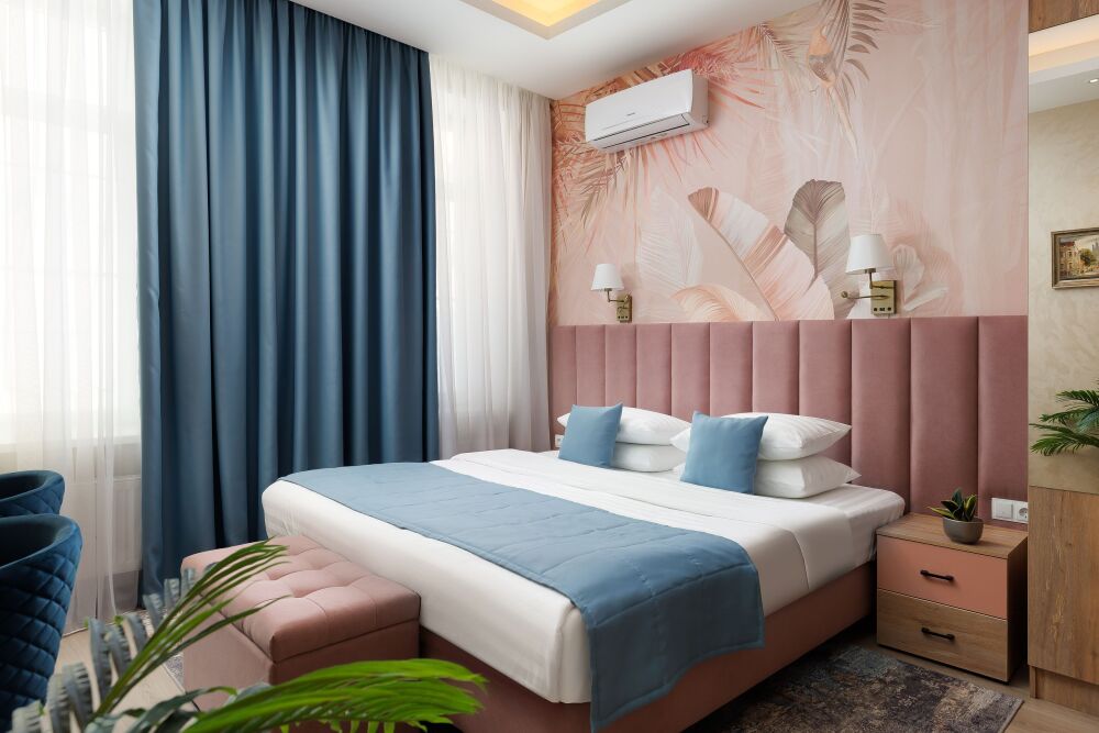 В каждом номере выполнен дизайнерский ремонт в спокойной цветовой гамме, чтобы отдых в отеле был приятным и расслабляющим.