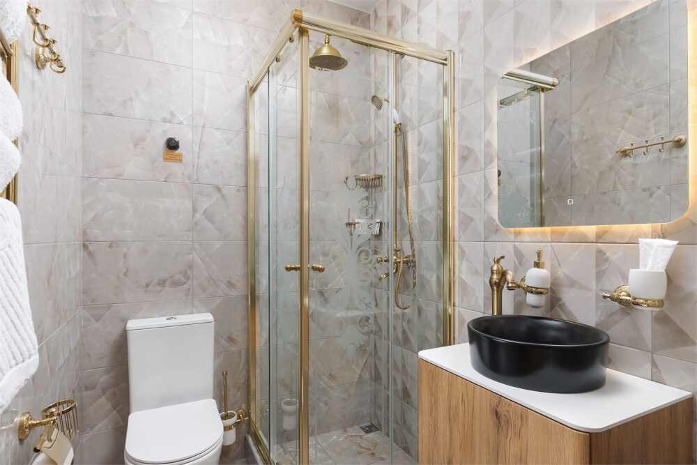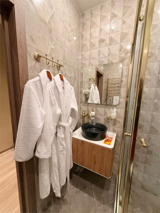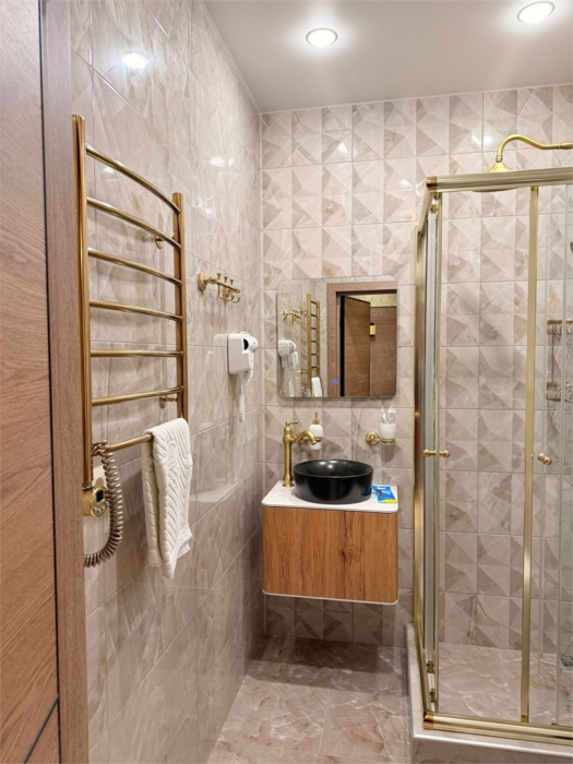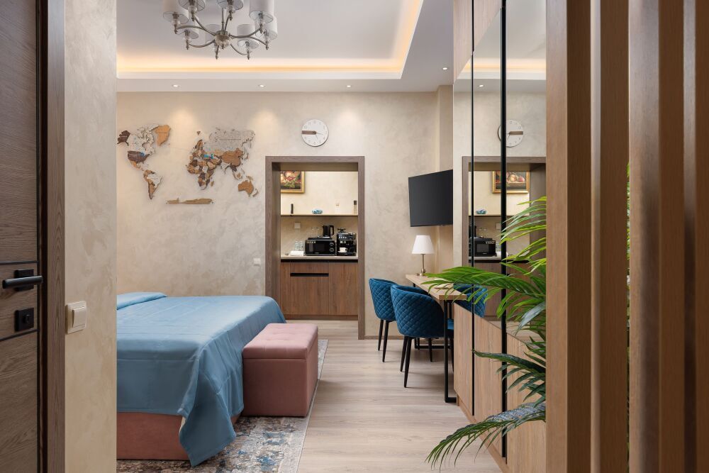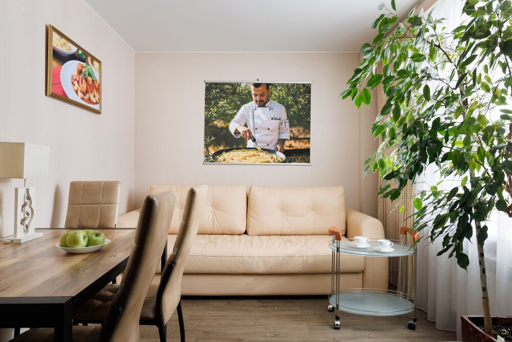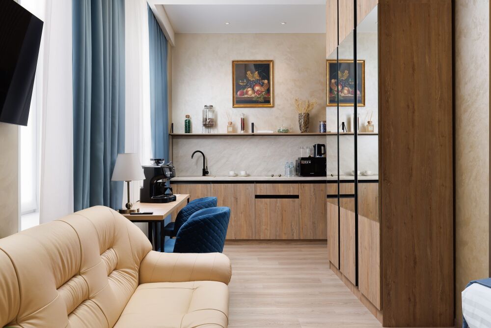 Большой номер с собственной ванной комнатой и мини-кухней. Наполнение номера: двуспальная кровать с ортопедическим матрасом, диван, прикроватные тумбы, шкаф для одежды, стол и стулья, телевизор. На кухне есть плита для приготовления еды, холодильник, электрический чайник, кофемашина и необходимый набор посуды для двух человек.