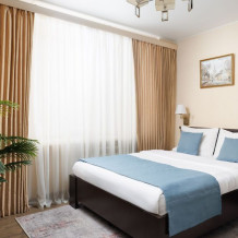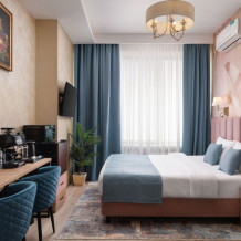 Номер с собственной ванной комнатой и мини-кухней. Наполнение номера: двуспальная кровать с ортопедическим матрасом, прикроватные тумбы, шкаф для одежды, стол и стулья, телевизор. На кухне есть плита для приготовления еды, холодильник, электрический чайник, кофемашина и необходимый набор посуды для двух человек. В номере 4 окна, что делает его очень светлым и уютным.