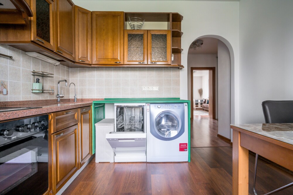 В квартире есть все необходимое для комфортного проживания: 1 уютная спальня с двуспальной кроватью, вместительным шкафом; вторая спальня-гостиная с кроватью и раскладным диваном, ЖК-телевизором; декоративным камином; балконом с зоной отдыха; кухня, оборудована всем необходимым: кухонный гарнитур, холодильник, кухонная утварь, свч, электрическая плита с духовкой и вытяжкой, стиральная машинка, посудомоечная машинка; совмещенный санузел с ванной.