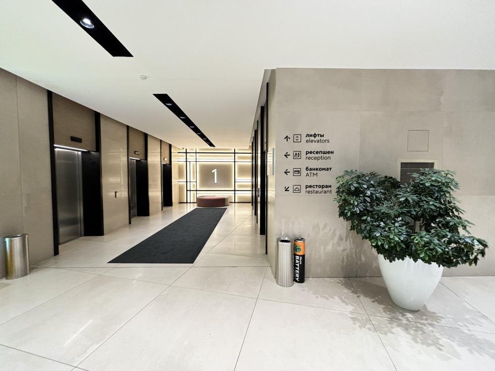 На первом этаже ЖК большое лобби: зона коворкинга, колясочная, ресторан, кофейня - 6 пассажирских лифтов,