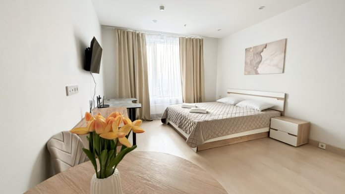 Светлые апартаменты студийной планировки предлагаются в апарт-отеле «YE'S Ботанический сад» для проживания. Качественная отделка в сочетании с удобной мебелью образуют комфортабельное пространство для жизни.