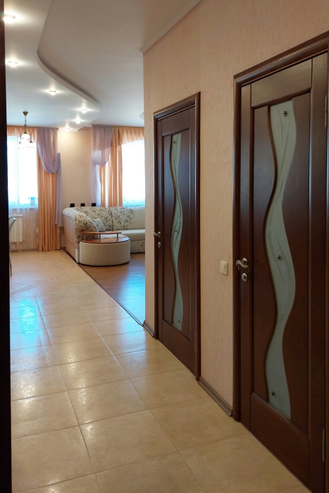 Оснащена всем необходимым для комфортного проживания: двухместный кровать, раскладной диван, раскладушка, постельное белье, полотенца, халат, одноразовые тапочки и средства для гигиены, уборки и стирки, телевизор(160 каналов), высокоскоростной Wi-Fi интернет, гладильная доска, утюг, пылесос, кухонные принадлежности.