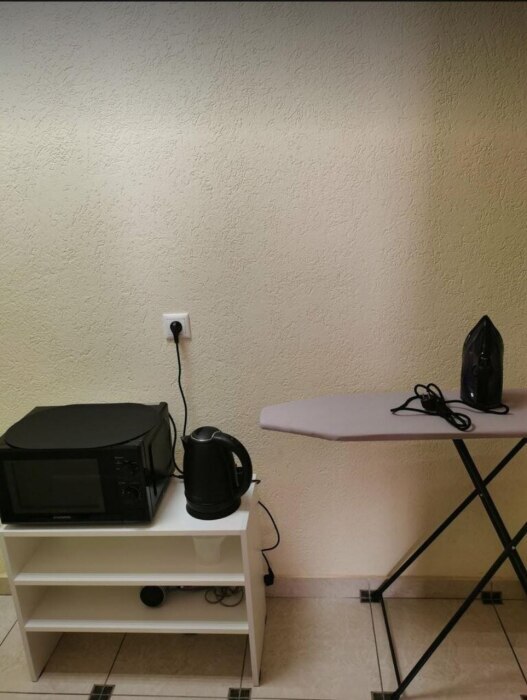 Таких номеров всего 3, на 2, 3, 4 этажах. Электрочайник, микроволновая печь, фен, утюг, гладильная доска находятся на каждом этаже, в коридоре, для общего пользования.