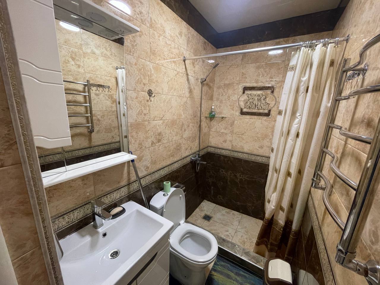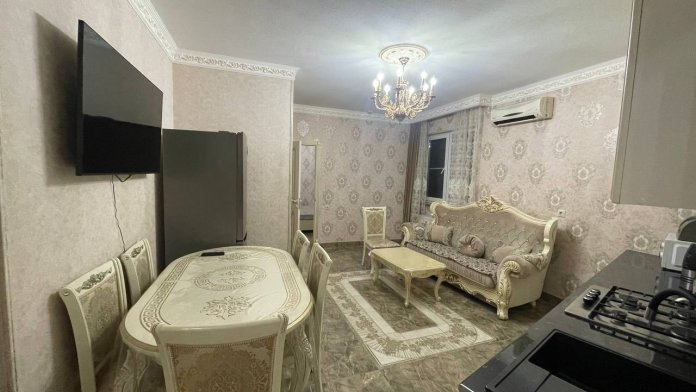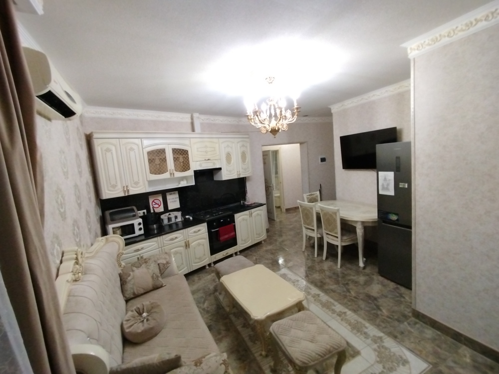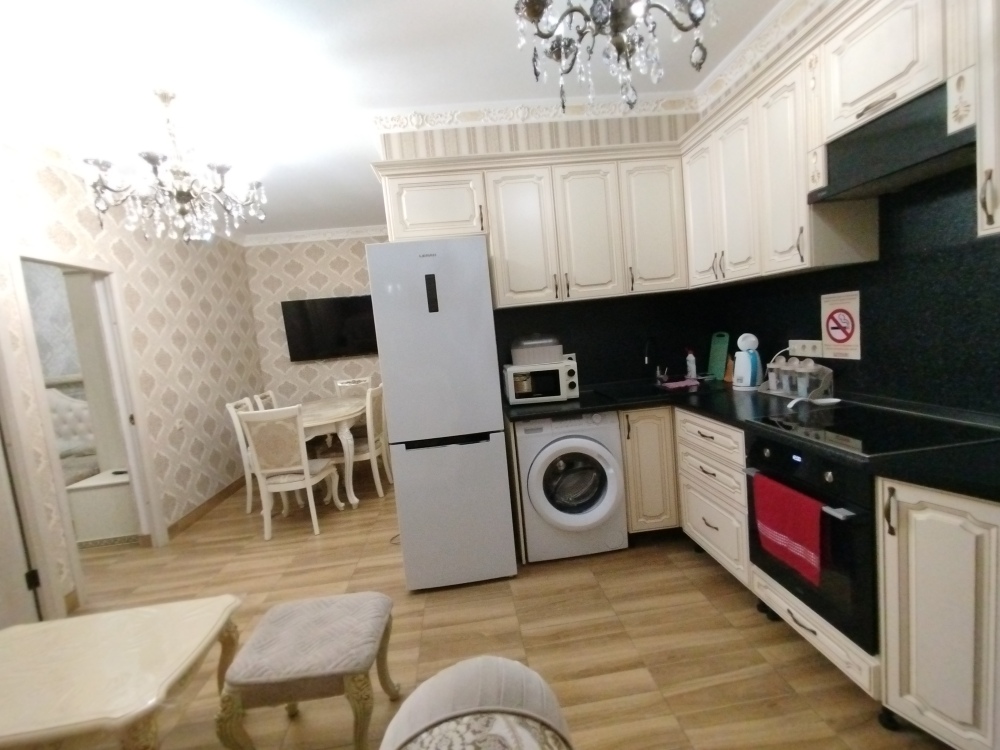 Апартаменты оснащены кондиционером и телевизорами, есть полноценная кухня и вся необходимая посуда для готовки, холодильник, стиральная машина. Также просторная ванная комната. В каждой комнате чистое постельное бельё и полотенца, которые по запросу поменяют.