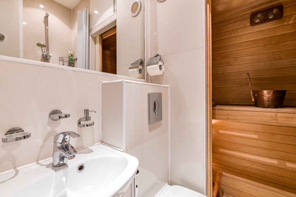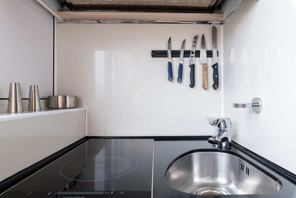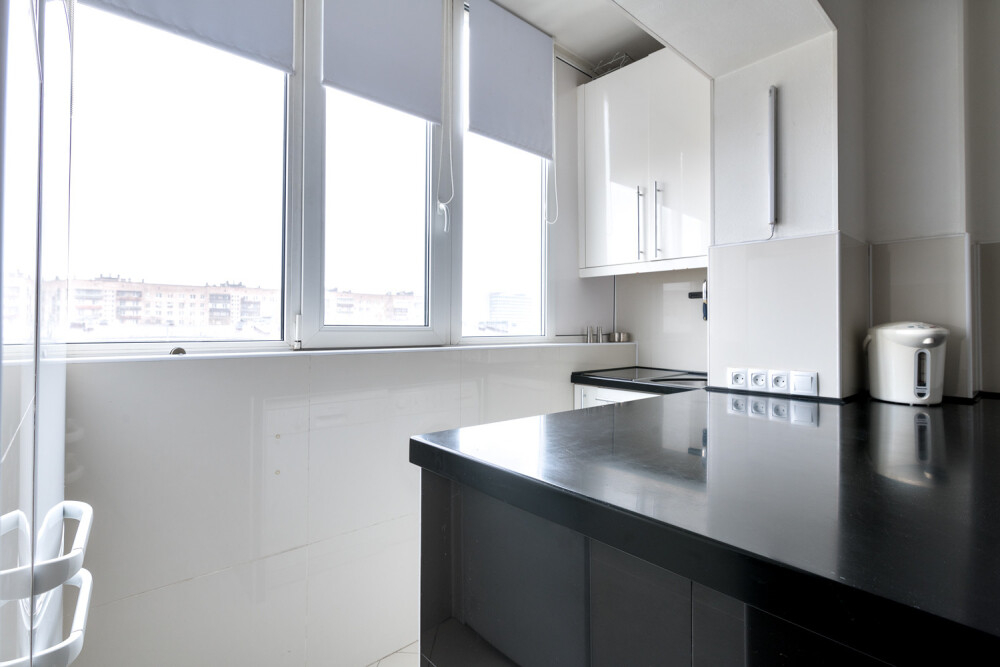 Дизайн выполненный в стиле high-tech, подходит для молодых, успешных и современных людей. В зоне гостинной расположены просторный угловой диван, раскладной диван Ikea и 59-ти дюймовый телевизор с DVD проигрывателем и музыкальным центром. Здесь есть все, что необходимо для проведения досуга в плохую погоду. В качестве дизайнерского решения мы использовали автоматические жалюзи для зонирования кухонной зоны. Кухня полностью оборудована всем необходимым для приготовления пищи и оснащена удобным барным столом и барными стульями.