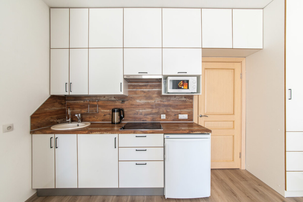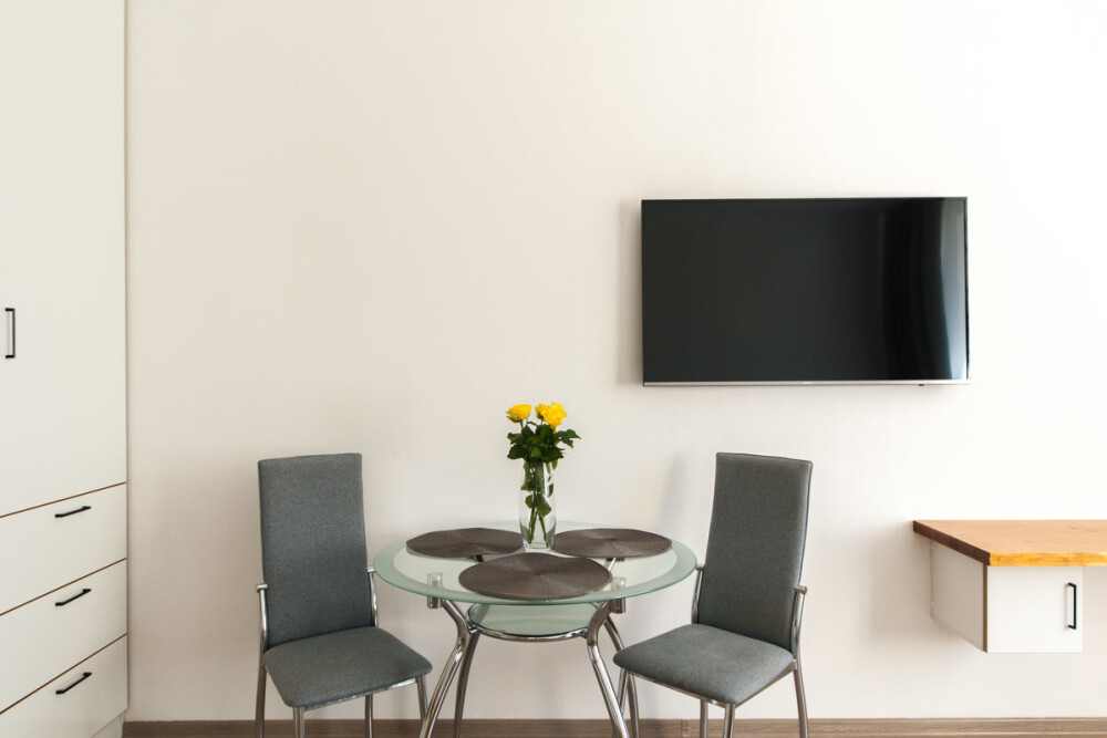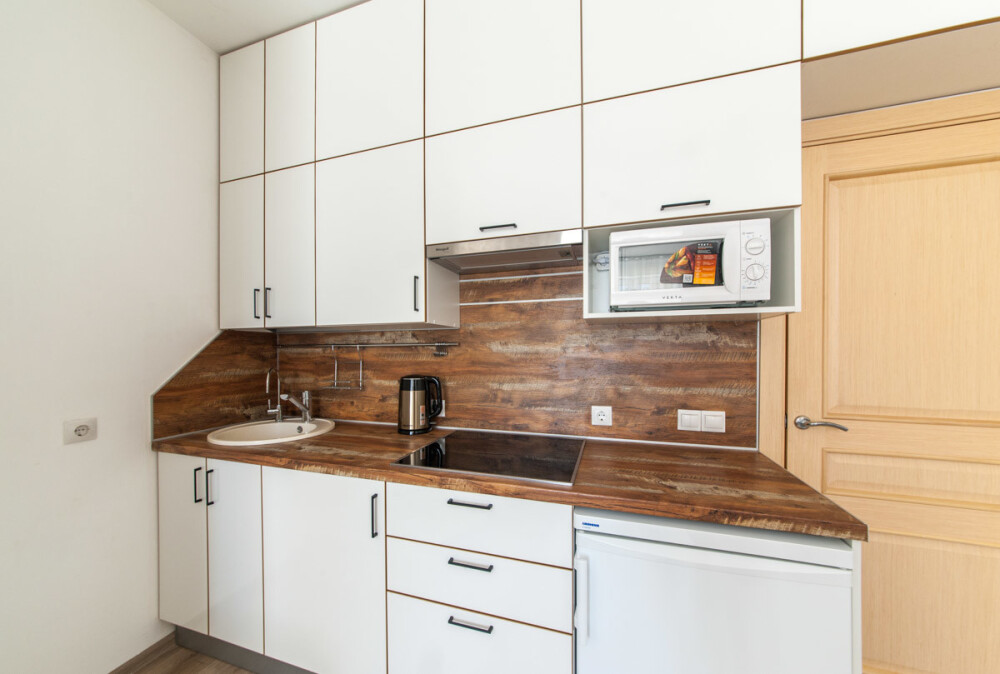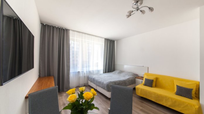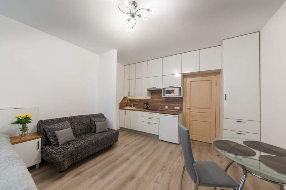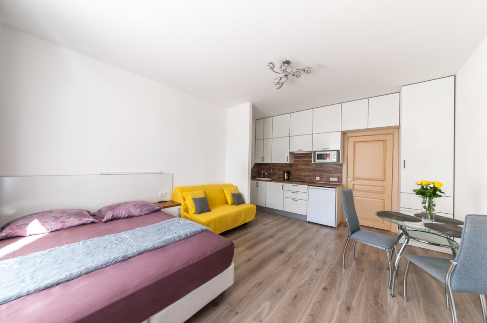 В квартире есть все необходимое для комфортного проживания: двуспальная кровать, раскладной диван, телевизор, кухонная зона со всем необходимым, совмещенный санузел.