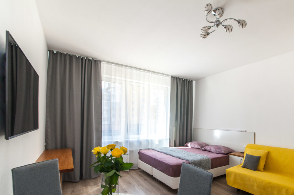 Уютная студия вмещает до 4-ти гостей и находится на 2 этаже дома бизнес-класса. Новый комплекс бизнес-класса располагается в одном из красивейших мест Московского района, рядом с Пулковским парком. Жилой дом находится в престижном квартале Московского района. Территория дома озеленена и благоустроена. Школы, детские сады, больницы, поликлиники, магазины, кафе, рестораны и салоны красоты в пешей доступности. Для любителей активного отдыха вблизи есть большой “Пулковский Парк”. Для любителей шоппинга в пешей доступности есть ТРЦ “ЛЕТО” с кинотеатром и гипермаркетом «Ашан»). Станция метро «Звездная» в 25 минутах пешком. До центра города 15 минут на метро без пересадок.