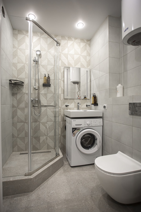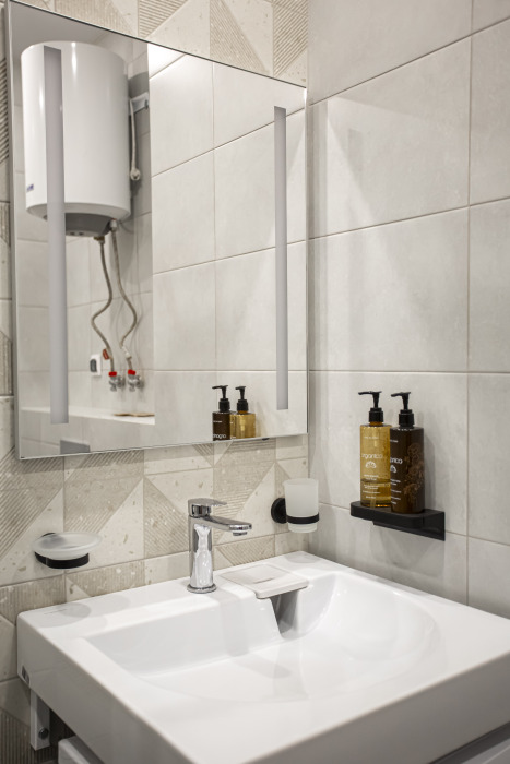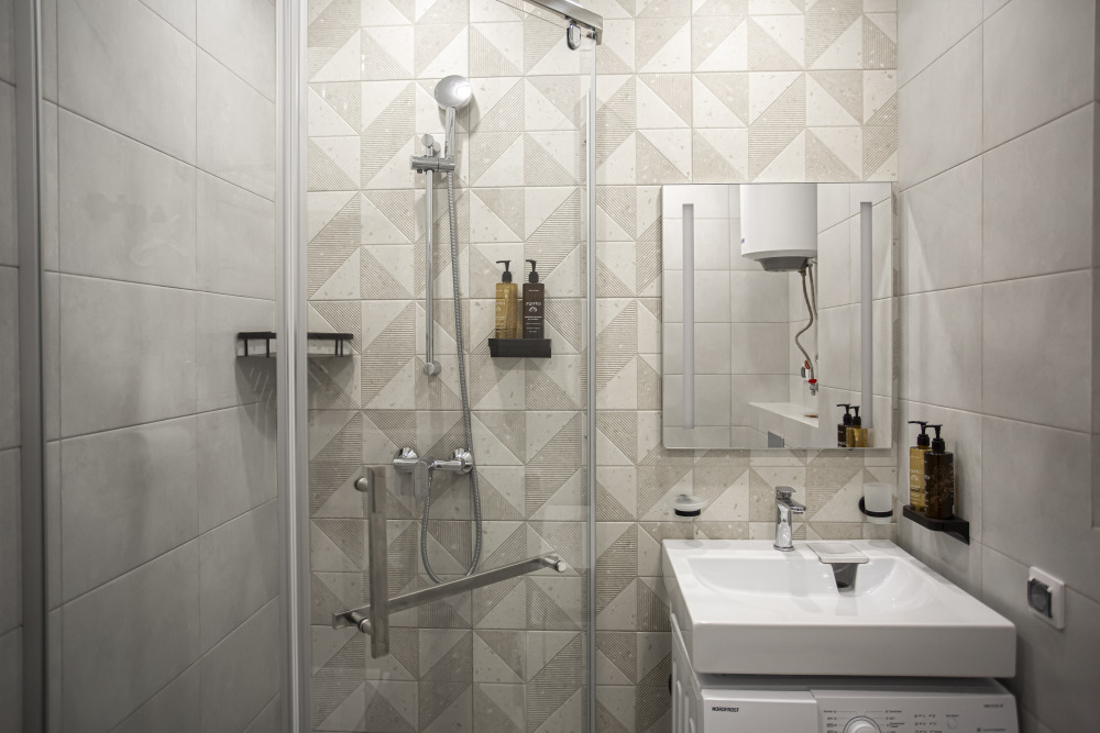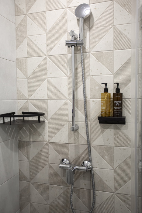 Ванная комната: душевая кабина, бойлер, гель для душа, шампунь, ароматное мыло, зубные наборы, тапочки.