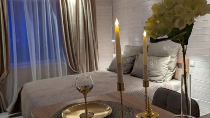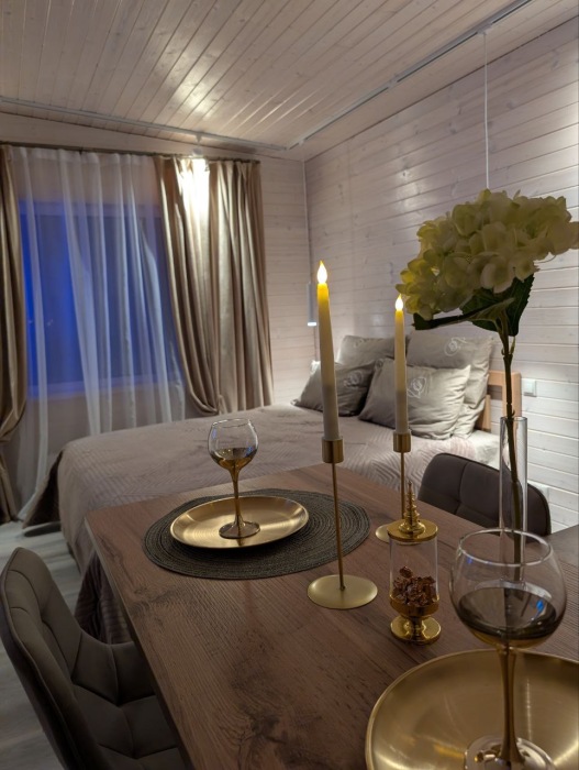 Внутри домика - светлая студия, интерьер в теплых тонах, комфортное спальное место, кровать Queen Size, удобный матрас премиум качества «Икеа», подушки отельного бренда, максимально комфортные условия для сна и отдыха. Одно дополнительное место по предварительному уведомлению.