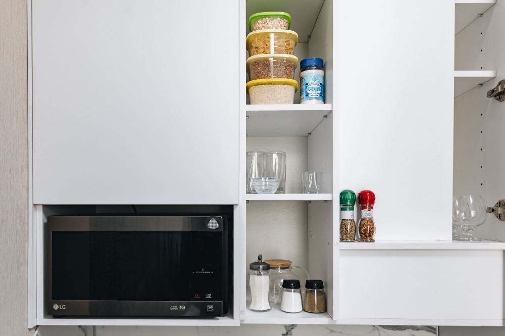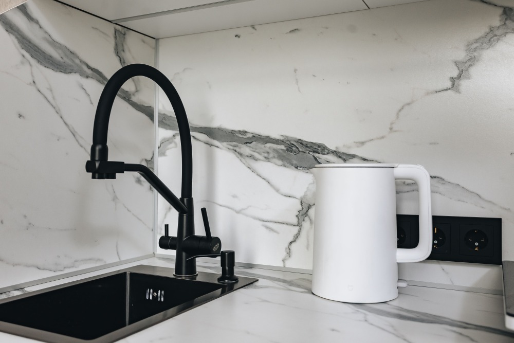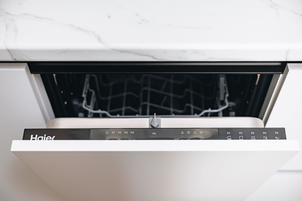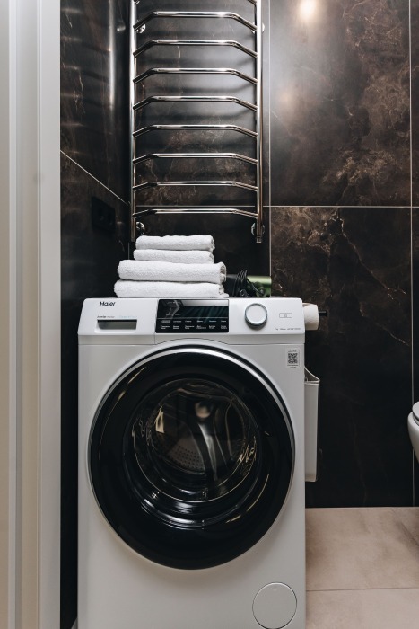 - Холодильник, варочная поверхность, стиральная машина, микроволновка, чайник и гейзерная кофеварка.